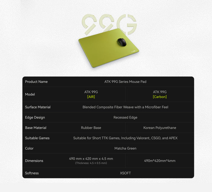 Với lớp đệm XSoft êm ái và độ dày 4mm, ATK 99G XSoft giảm mỏi cổ tay trong các phiên chơi game dài. Trọng lượng nhẹ và viền may chìm tinh tế đảm bảo độ bền và thẩm mỹ, phù hợp cho cả gaming và công việc văn phòng. Có hai phiên bản: 99G Air (mềm mại hơn) và 99G Carbon (kiểm soát tốt hơn).