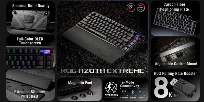 ASUS ROG Azoth Extreme là bàn phím cơ cao cấp hoàn hảo, kết hợp switch ROG NX chính xác, OLED display thông minh và kết nối tri-mode linh hoạt. Đây là lựa chọn lý tưởng cho game thủ muốn hiệu suất đỉnh cao, âm thanh xuất sắc và thiết kế premium.