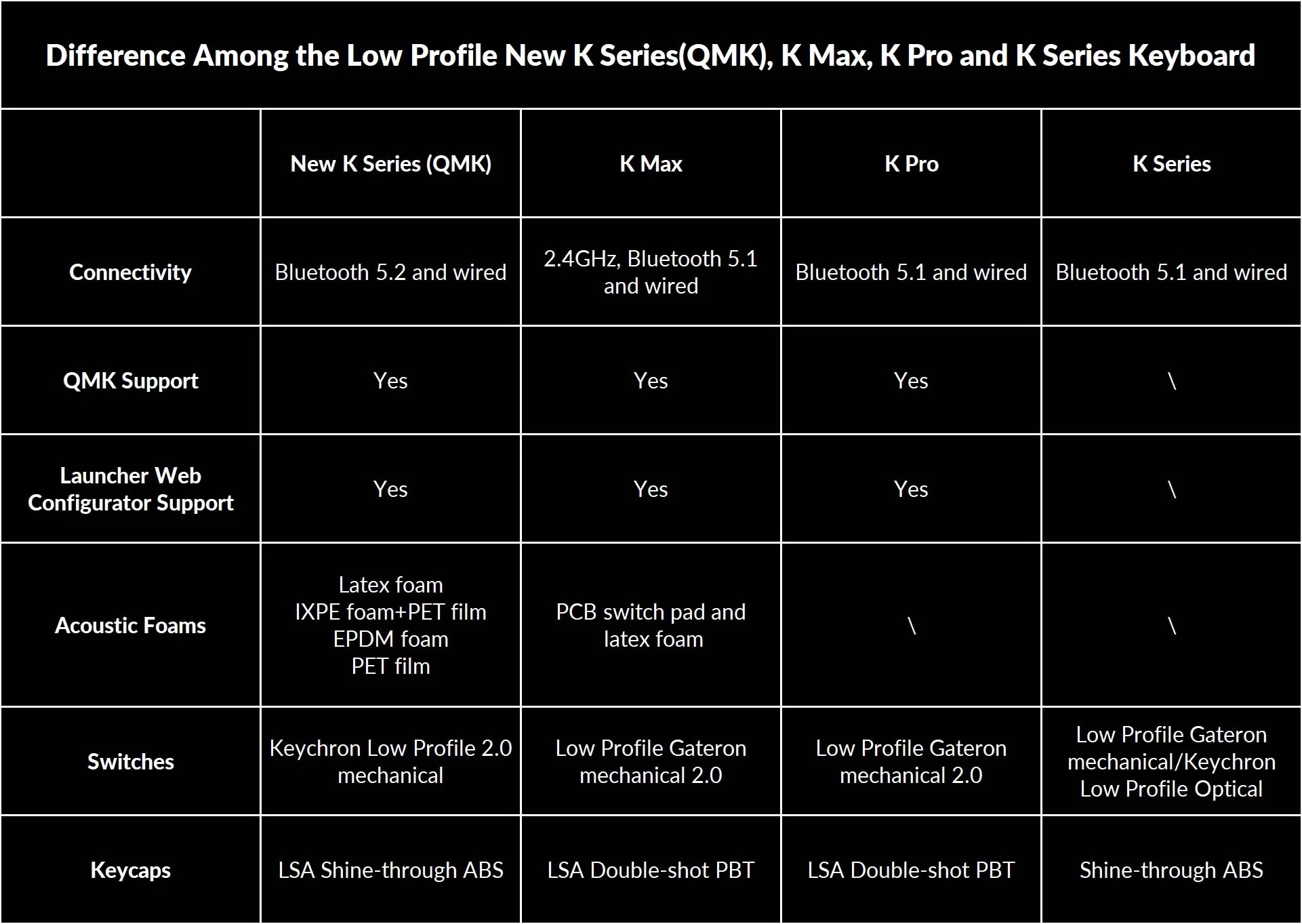 | Switch | Keychron low-profile (Red/Blue/Brown, ~50g, 2.5mm, 50M lần nhấn) |