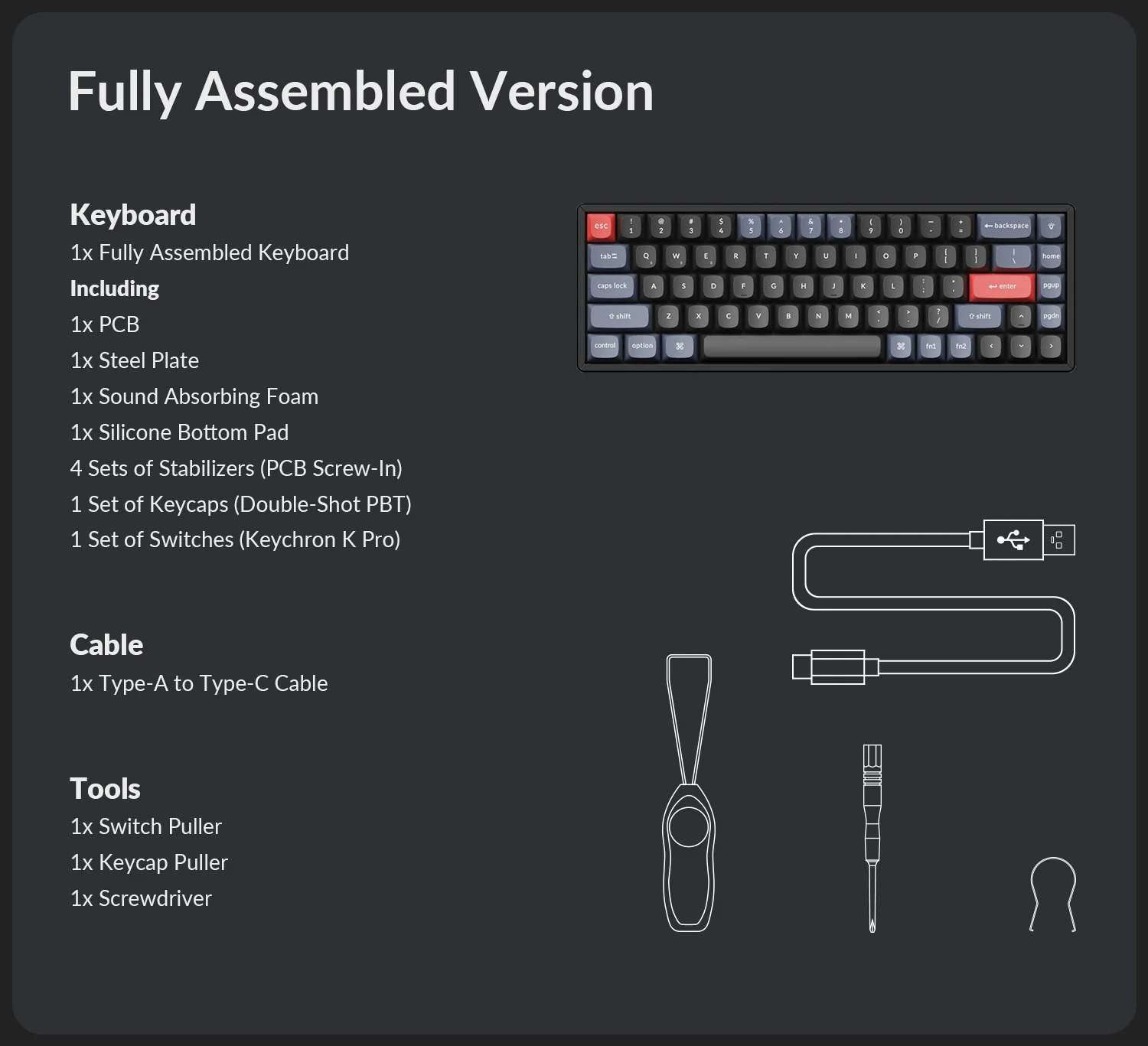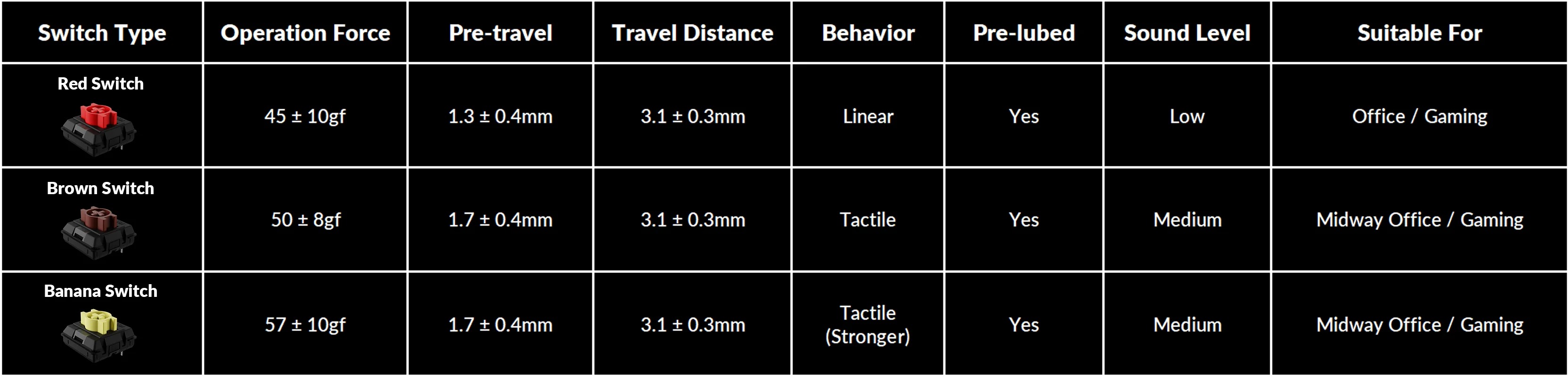 | Stabilizers | Pre-lubed, low-profile, reinforced |