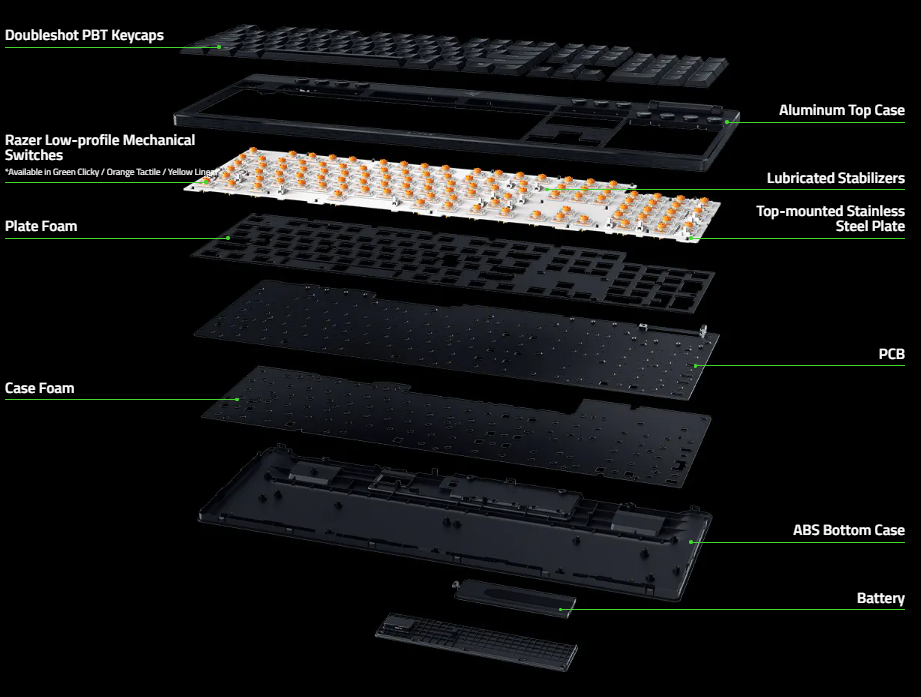 Các công tắc low-profile Green Clicky, Orange Tactile hoặc Yellow Linear của Razer mang lại khả năng kích hoạt nhanh và chính xác với hành trình phím chỉ 2.8mm. Mỗi loại công tắc có đặc điểm âm thanh và cảm giác riêng, phù hợp cho cả chơi game lẫn gõ phím. Bàn phím tích hợp lớp foam giảm âm và tấm thép không gỉ, đảm bảo âm thanh gõ sạch và cảm giác phím mượt mà.