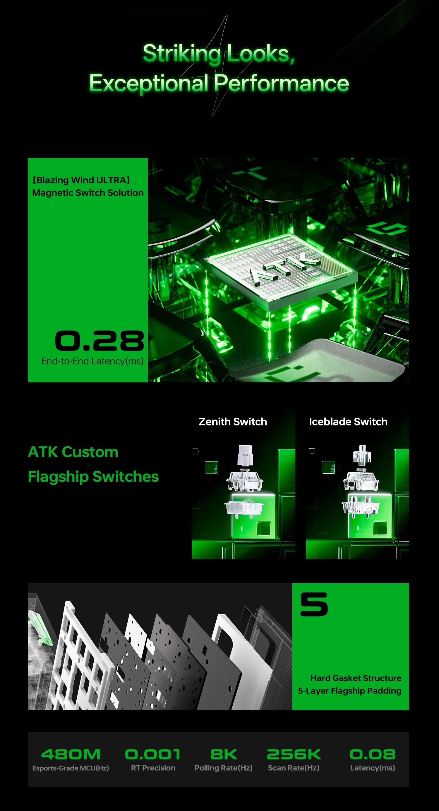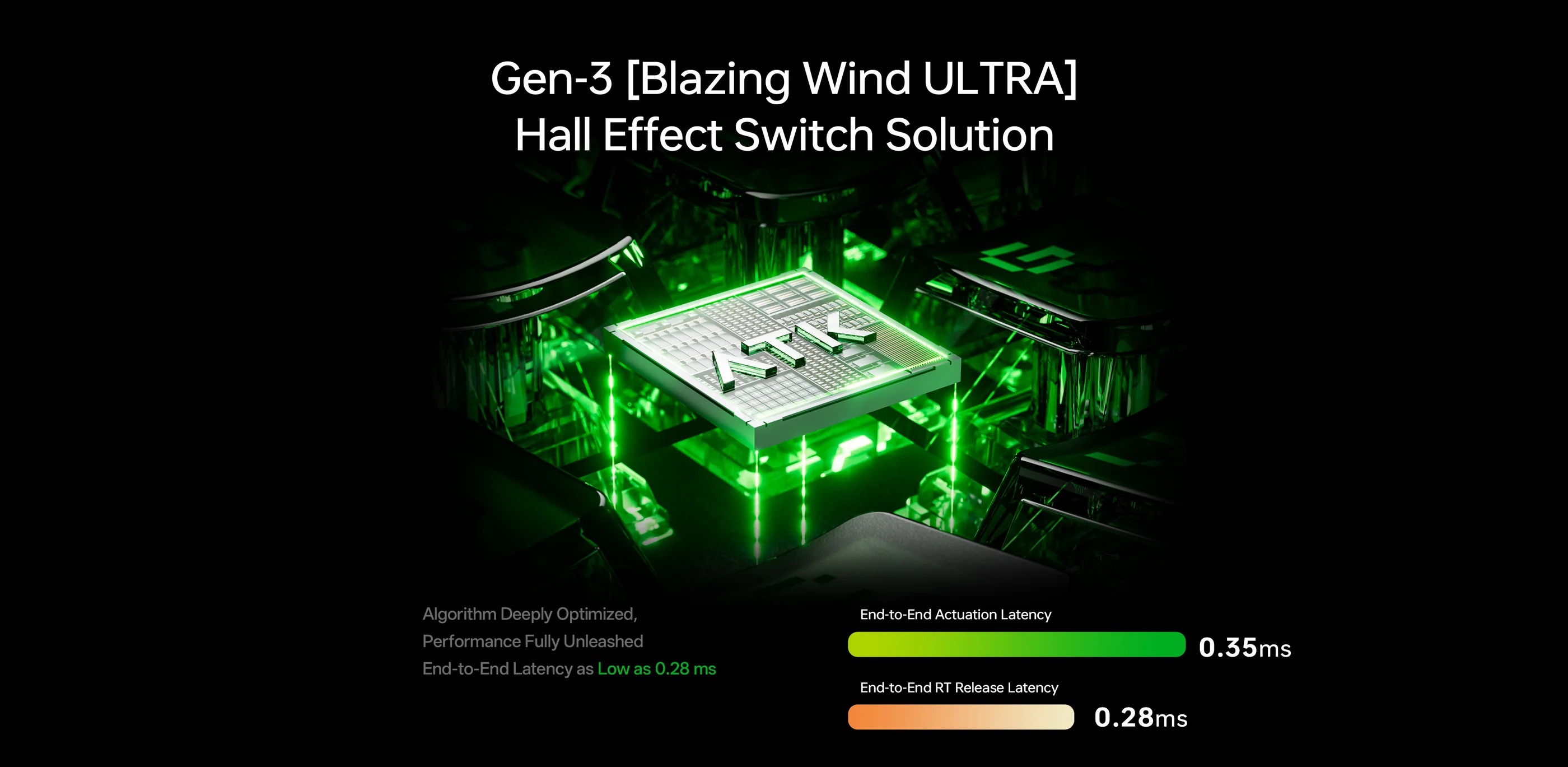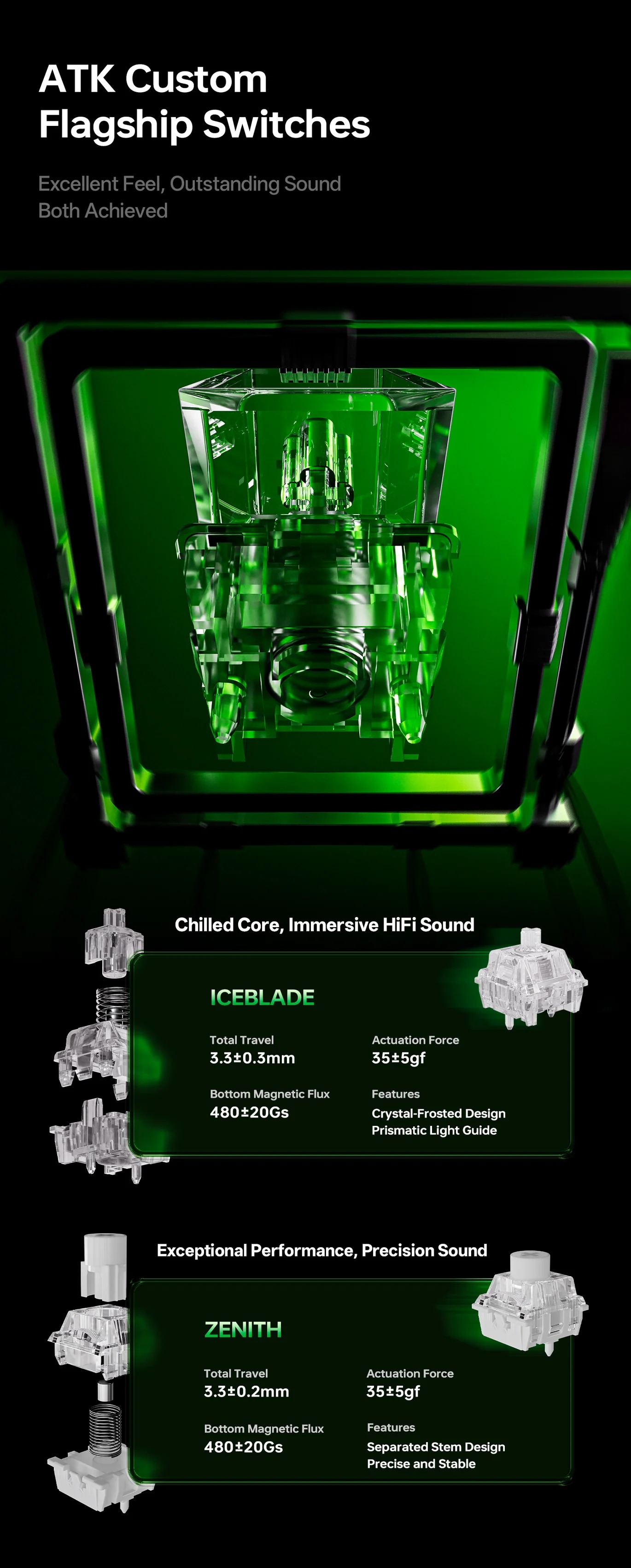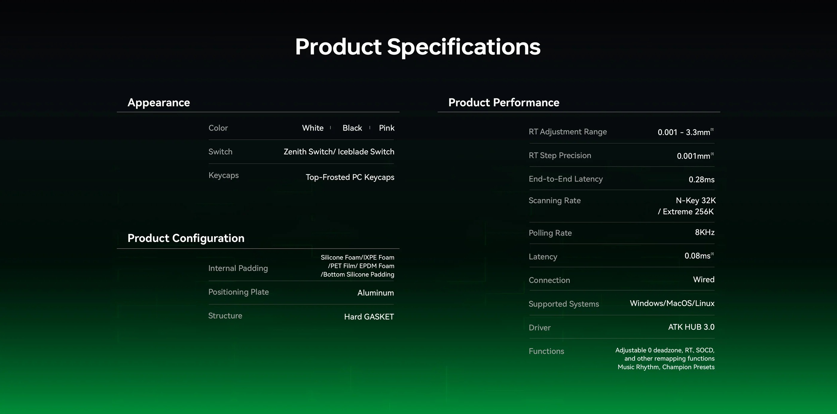 Bàn phím sử dụng switch Hall Effect Zenith magnetic linear, tùy chỉnh actuation từ 0.1-4.0mm, hỗ trợ rapid trigger, dynamic keystroke và SOCD cho phản hồi nhanh chóng. Polling rate 8KHz, scanning rate cao, lý tưởng cho CS2, Valorant, Apex Legends với độ chính xác và tốc độ vượt trội.