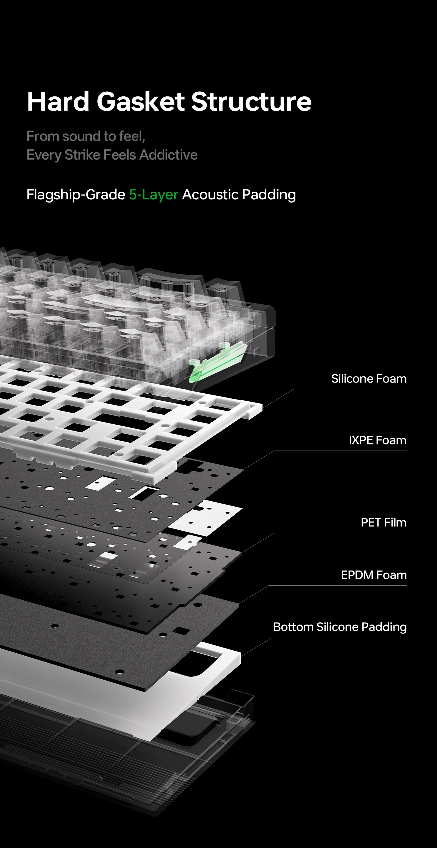 Khung nhôm hợp kim siêu nhẹ chỉ 430g với gasket mount đa lớp, poron foam mang lại flex mềm mại và âm thanh creamy thocky êm ái. Layout 60% compact, hot-swap 5-pin cho tùy biến dễ dàng.