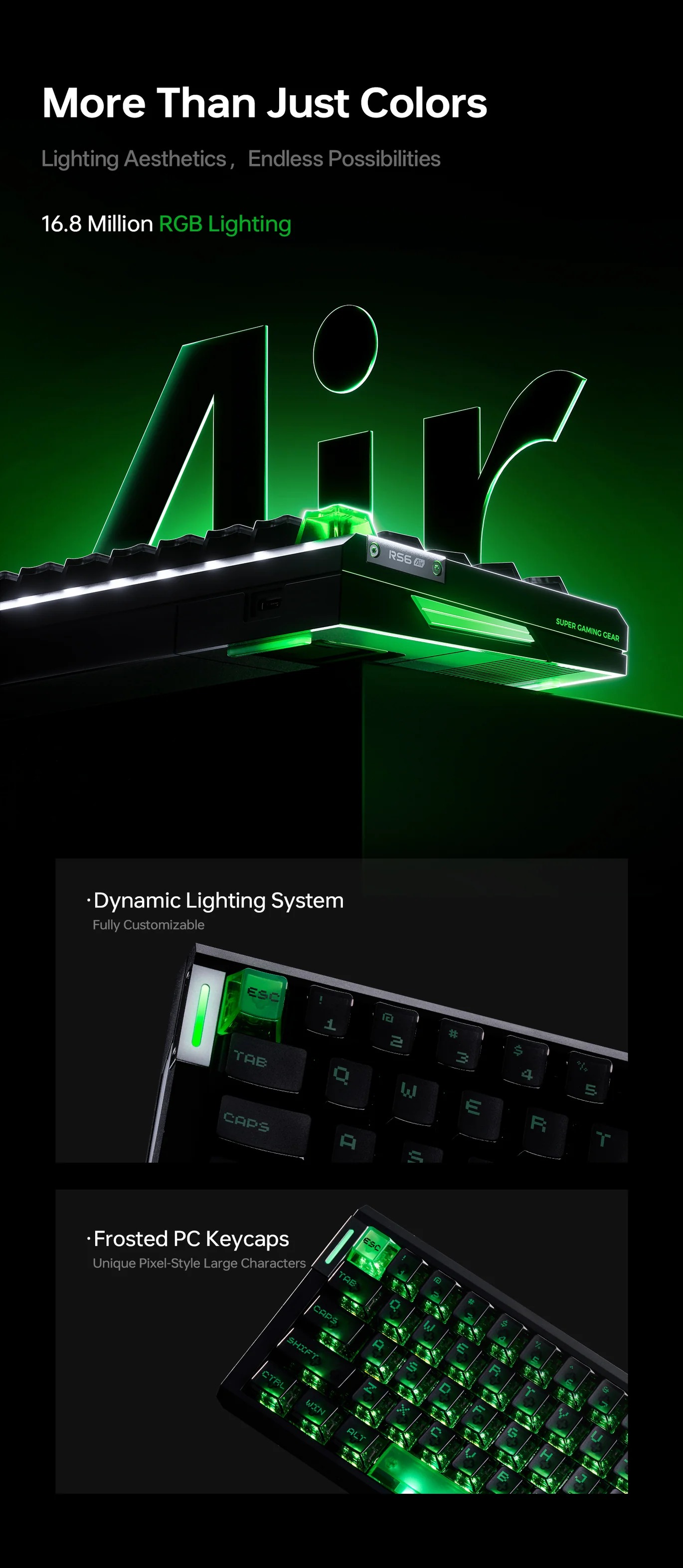 RGB 16 triệu màu south-facing tùy chỉnh đẹp mắt, kết nối Bluetooth 5.0 (3 thiết bị), 2.4GHz low latency và wired USB-C. Pin lâu cho sử dụng di động thoải mái.