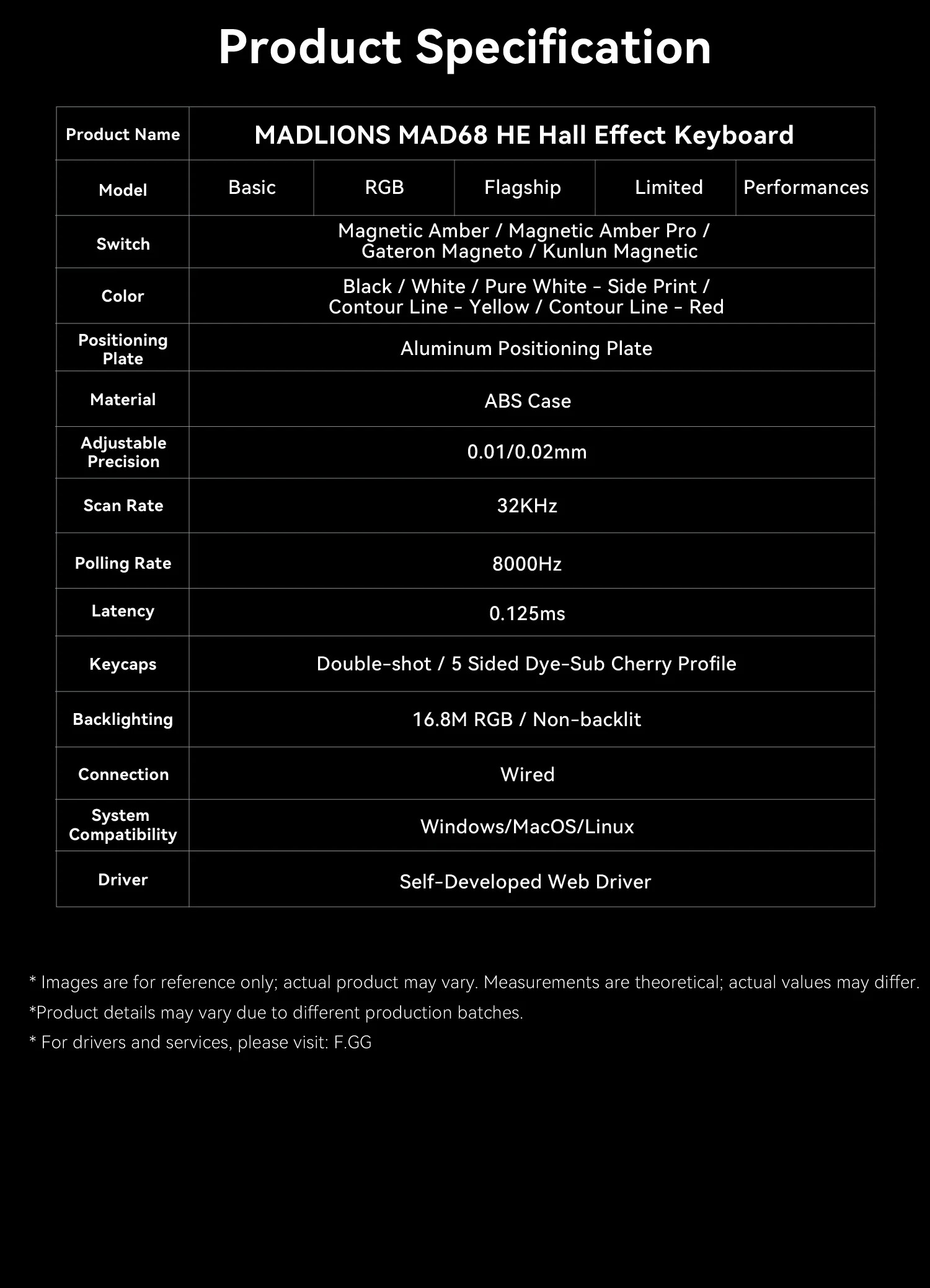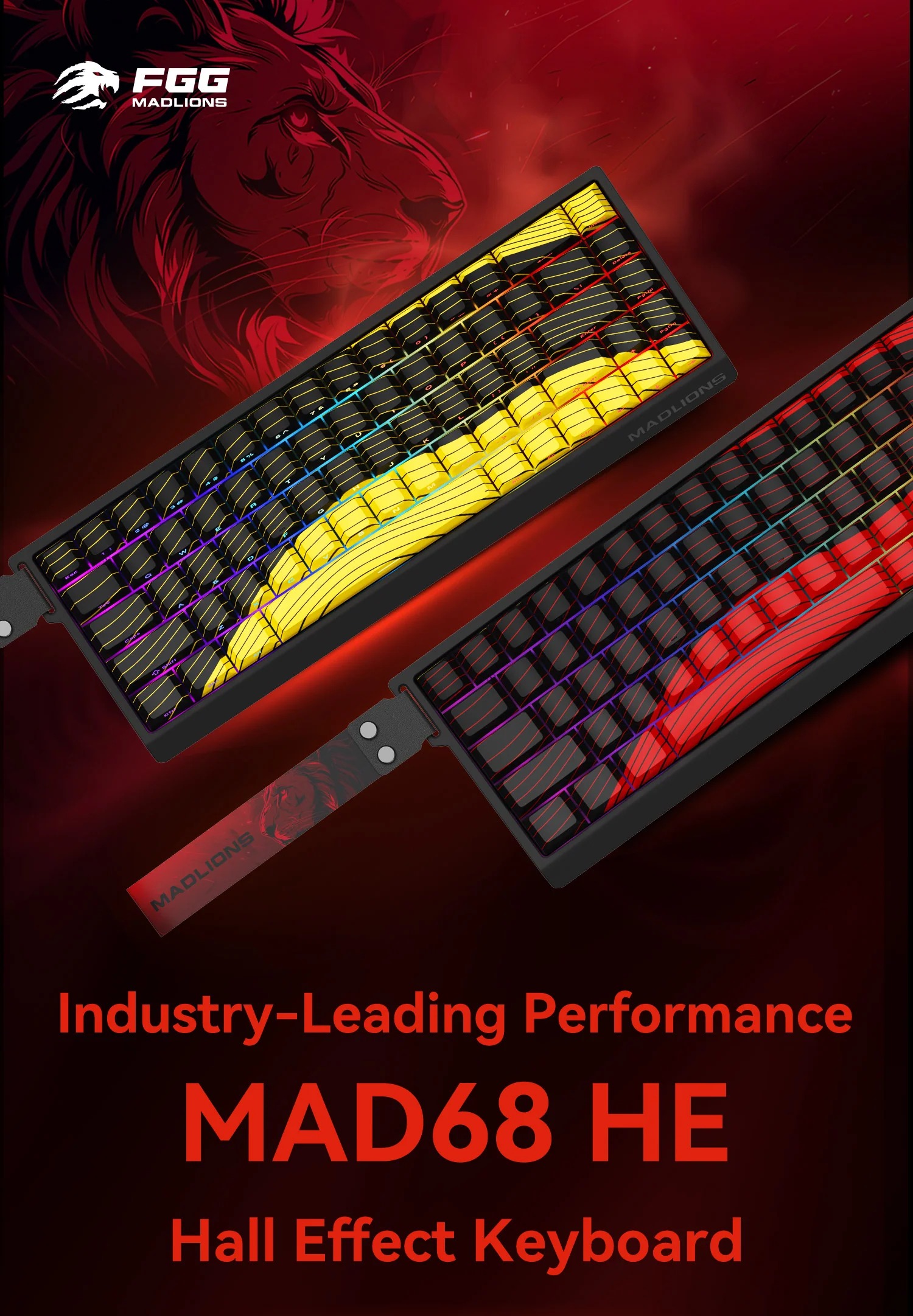 Bàn phím HE có dây FGG MAD68 (Basic, RGB, Performance, Flagship V2, Flagship) mang đến hiệu suất đỉnh cao với switch từ tính Amber PRO (Flagship, Flagship V2) hoặc Gateron Jade (Basic, RGB, Performance). Công nghệ Rapid Trigger và hành trình phím tùy chỉnh 0.01-3.3mm với độ chính xác 0.02mm đảm bảo phản hồi tức thì. Polling rate 8000Hz (trừ Basic) và tần số quét 16KHz mang lại trải nghiệm mượt mà, lý tưởng cho các game FPS như VALORANT, CSGO, và APEX.