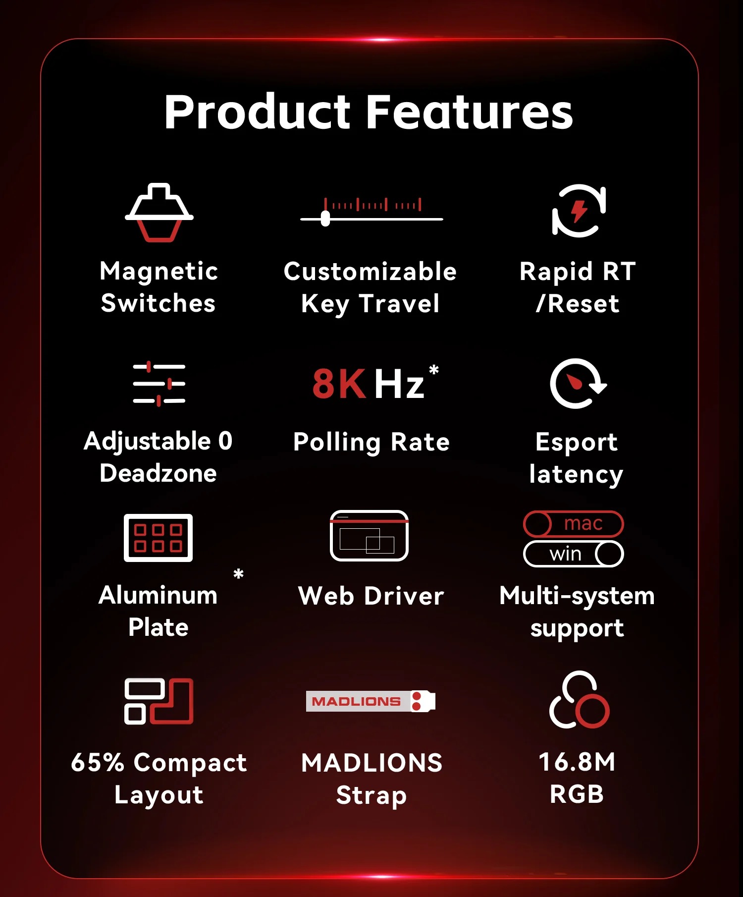 Hỗ trợ trình điều khiển web MAD60/68, cho phép tùy chỉnh hành trình phím (0.01-3.3mm), ánh sáng RGB 16.8 triệu màu (RGB, Performance, Flagship, Flagship V2), và macro. Hot-swap 5 pin và gasket mount mang lại sự linh hoạt tối đa, hỗ trợ cả gaming và công việc văn phòng.