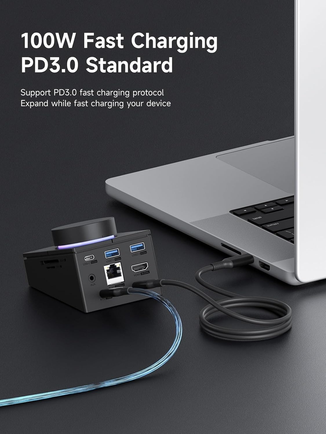 3 cổng Usb type C. Trong đó 1 cổng cấp điện cho hub, 1 cổng công suất 100W cho phép sạc điện thoại, máy tính và máy tính bảng siêu nhanh. Cuối cùng là 1 cổng truyền dữ liệu với băng thông khủng, cho phép truyền tải dữ liệu với tốc độ 5gbps