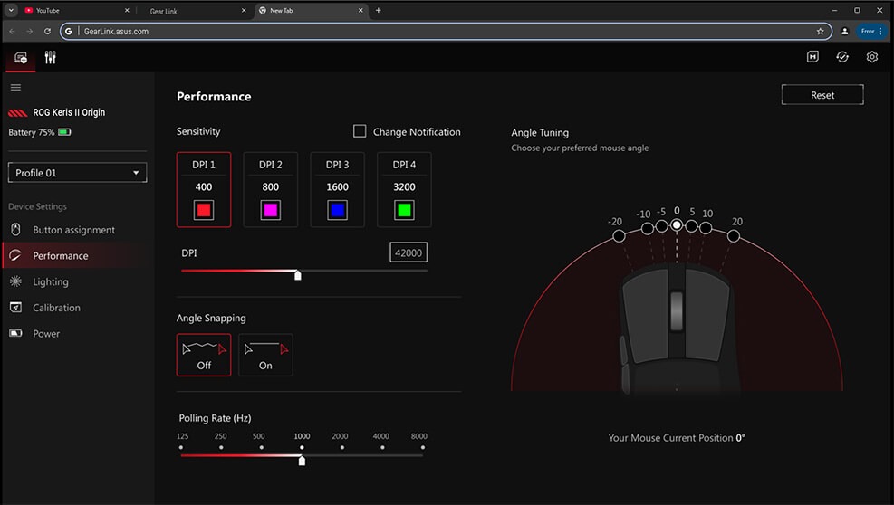 Cảm biến quang học ROG AimPoint Pro cung cấp độ phân giải lên đến 42.000 DPI, hỗ trợ công nghệ Track-on-Glass, cho phép theo dõi chính xác trên mọi bề mặt, kể cả kính. Với tốc độ tối đa 750 IPS và gia tốc 50G, chuột này là lựa chọn lý tưởng cho các tựa game FPS đòi hỏi phản xạ nhanh.
