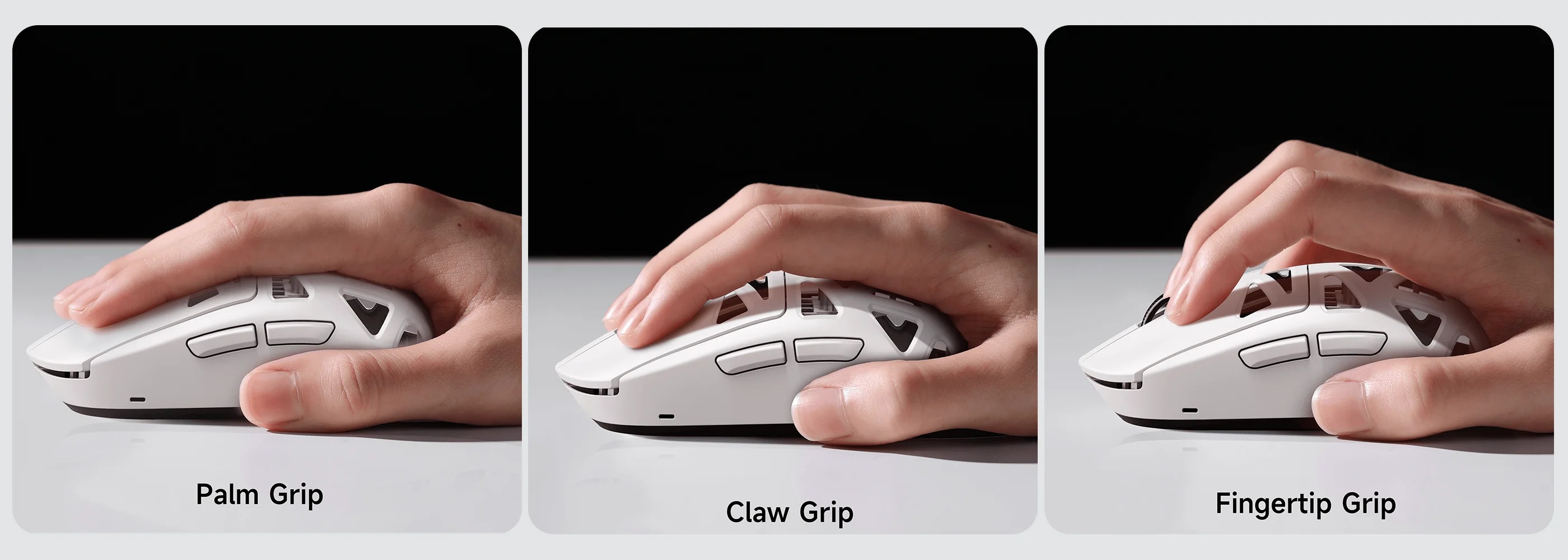 Shape symmetrical medium (122 x 63 x 38mm), phù hợp palm/claw/fingertip grip, trọng lượng 45g nhờ khung magnesium alloy siêu nhẹ. Lớp phủ chống trượt, hump cao hỗ trợ palm tốt, sensor vị trí trung tâm cho độ chính xác cao.