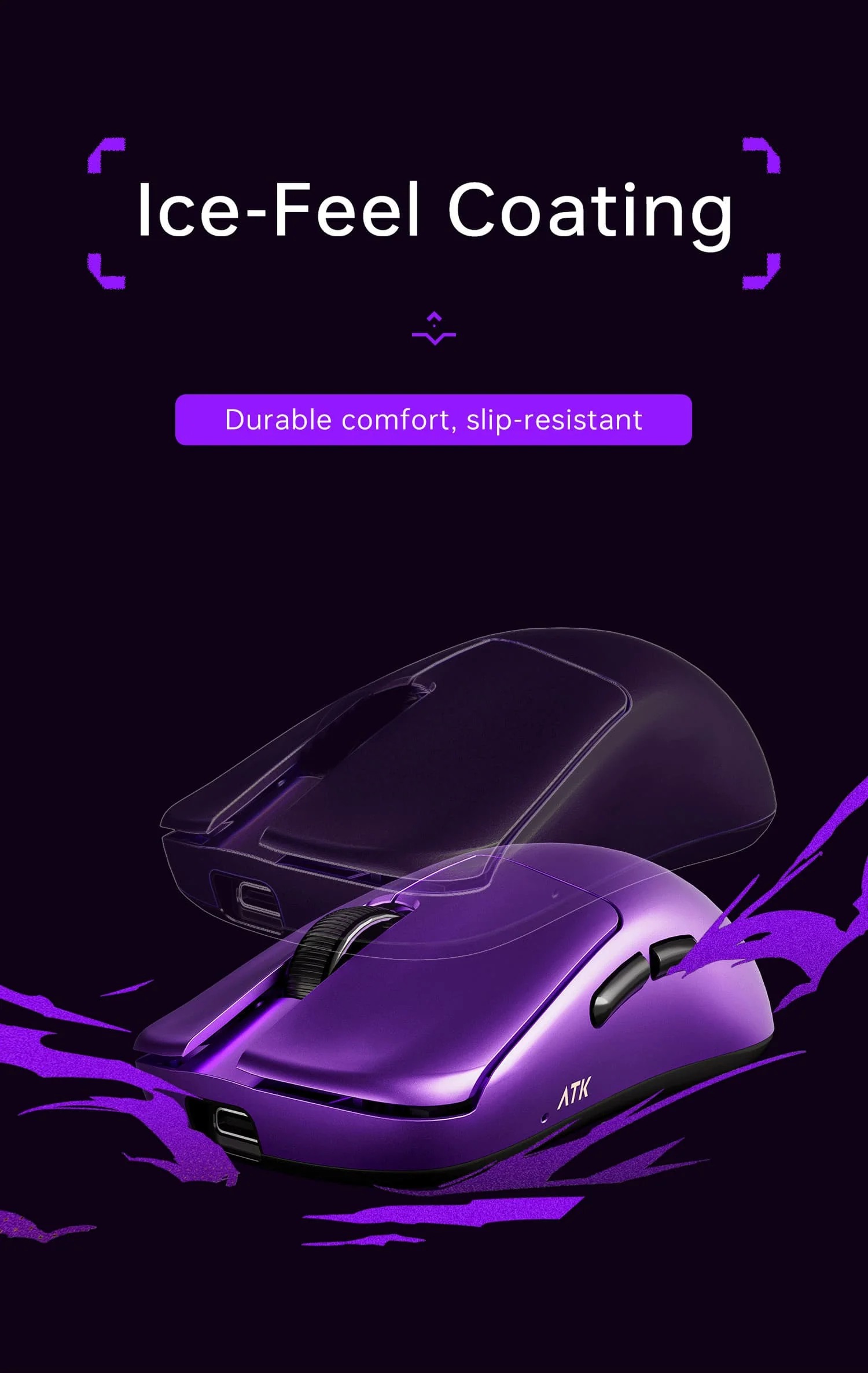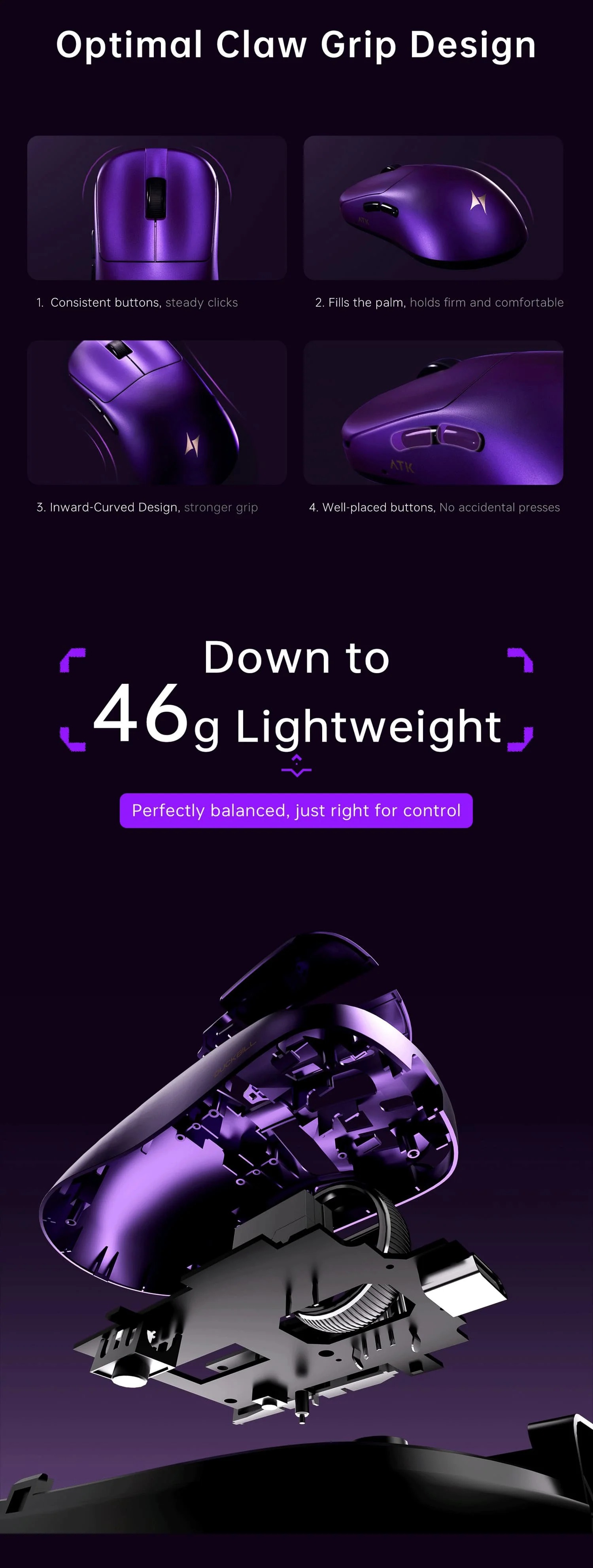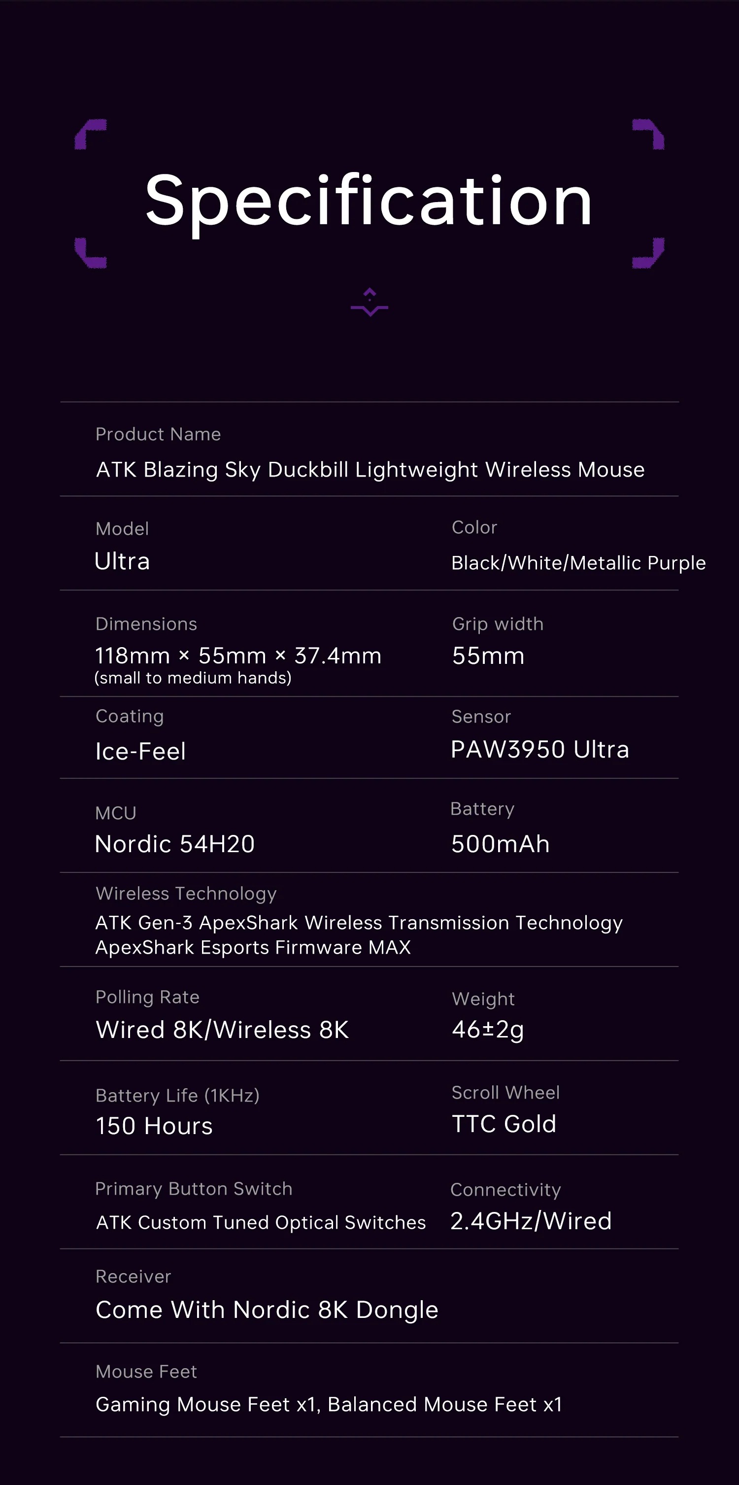 ATK Blazing Sky Duckbill sử dụng thiết kế duckbill với đường cong thân chuột ôm sát bàn tay, hỗ trợ cầm claw grip và fingertip grip thoải mái. Trọng lượng chỉ 55g nhờ cấu trúc honeycomb nhẹ, lớp vỏ nhựa cao cấp phủ matte chống trượt, phù hợp cho bàn tay trung bình đến lớn. Đi kèm grip tape tùy chỉnh để tăng độ bám tay trong các phiên gaming dài.