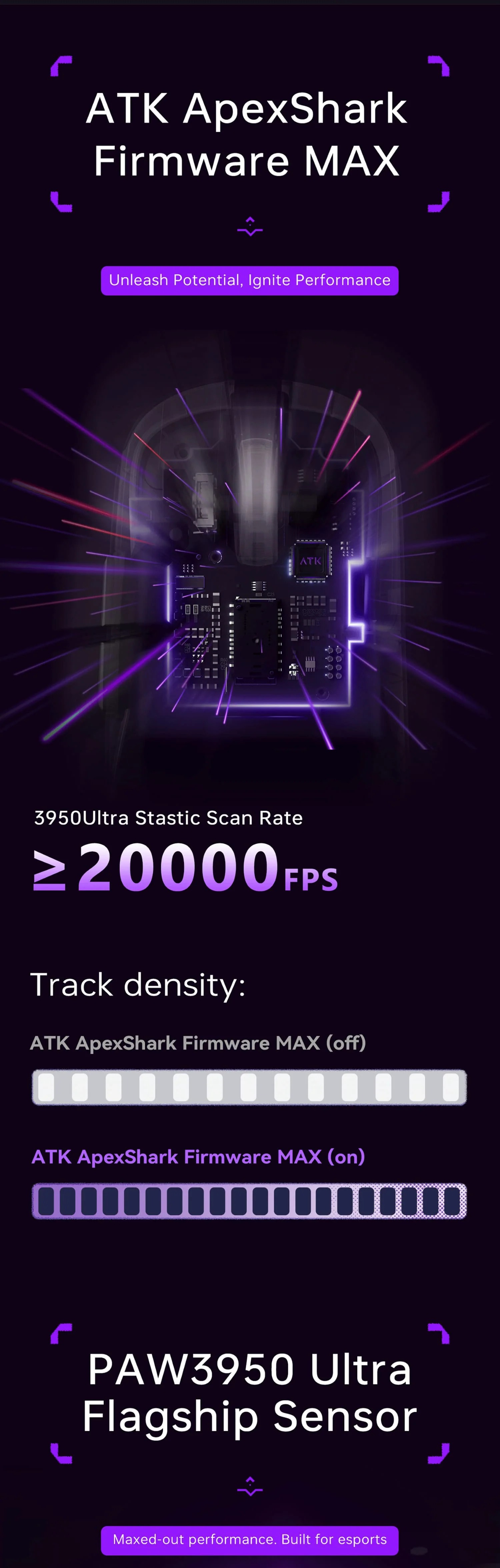 Trang bị cảm biến quang học PixArt PAW3395 với độ phân giải lên đến 26.000 DPI, tốc độ theo dõi 650 IPS và gia tốc 50G. Cảm biến này đảm bảo độ chính xác tuyệt đối, không lag, hoạt động mượt mà trên mọi bề mặt, từ bàn di chuột vải đến kính, tối ưu cho gaming cạnh tranh cao.
