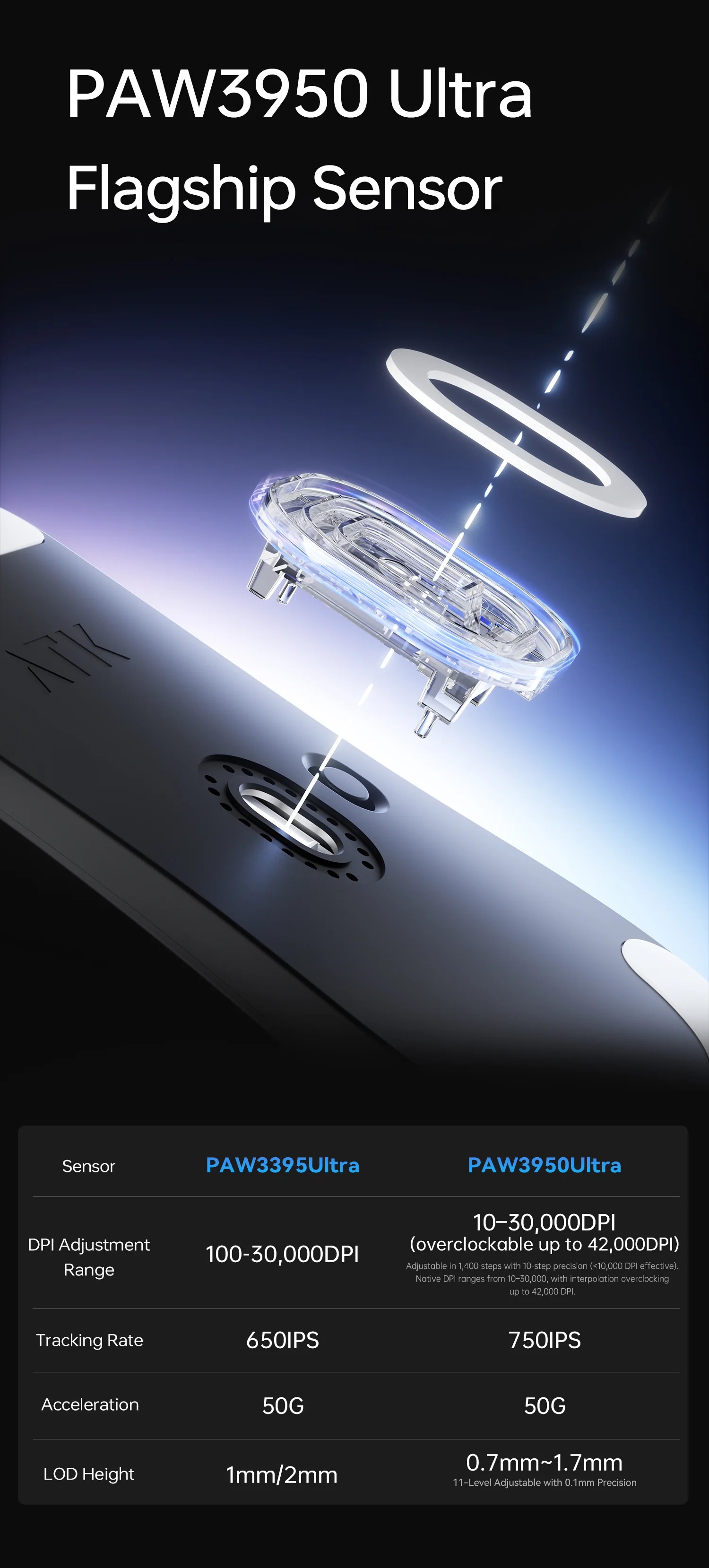 Trang bị switch quang học ATK tùy chỉnh với độ bền 100 triệu lần click, mang lại phản hồi nhanh và xúc giác rõ ràng. Cảm biến PixArt PAW3950 Ultra với độ phân giải lên đến 30.000 DPI, tốc độ theo dõi 750 IPS và gia tốc 70G, đảm bảo độ chính xác tuyệt đối, không lag, hoạt động mượt mà trên mọi bề mặt.