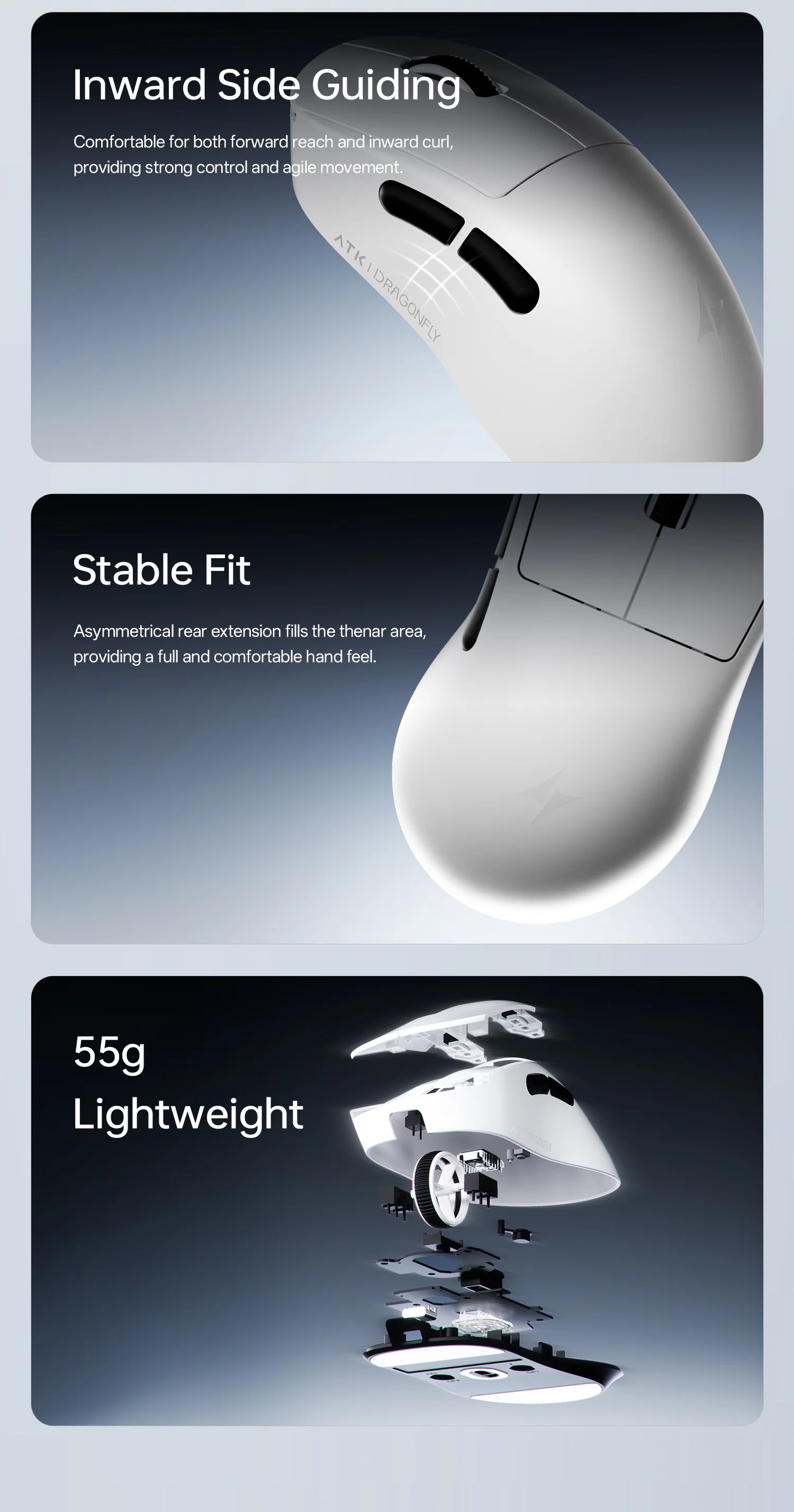 Chuột có trọng lượng chỉ 39g nhờ khung magnesium alloy siêu nhẹ, shape symmetrical medium phù hợp palm/claw/fingertip grip. Grip tape chống trượt, skates PTFE 100% mịn màng cho cloth/glass pad.
