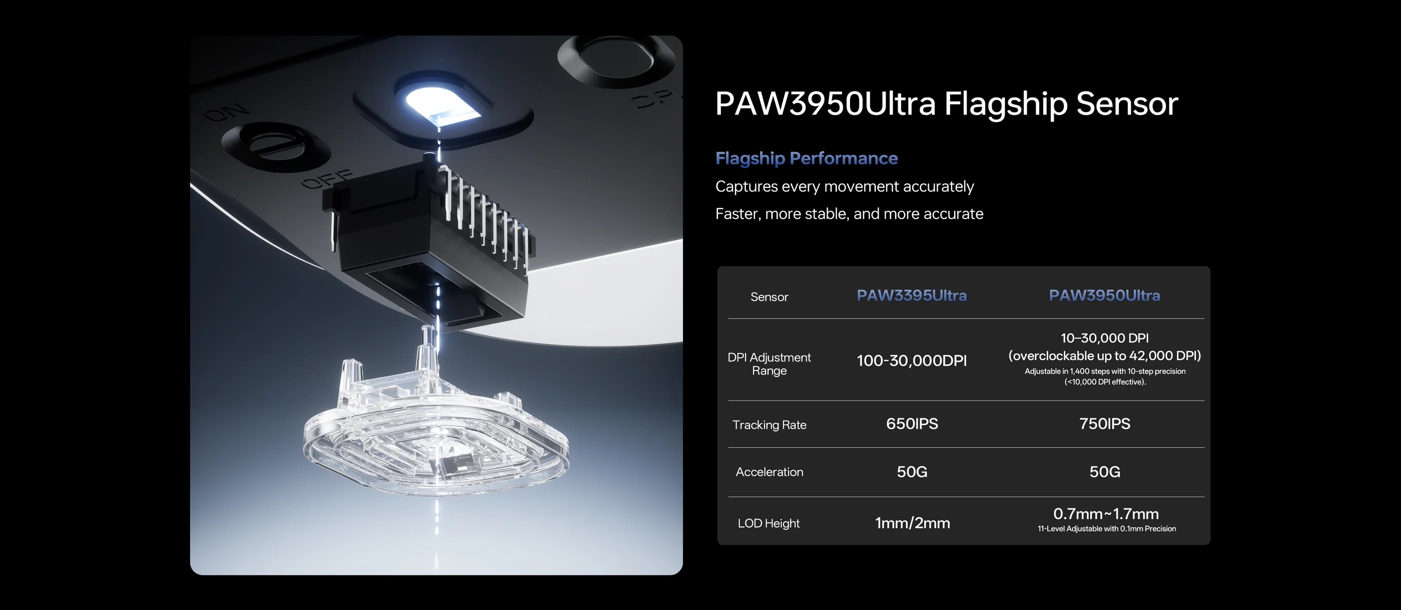 | Sensor | PixArt PAW3950 (30K DPI, 750 IPS, 50G) |