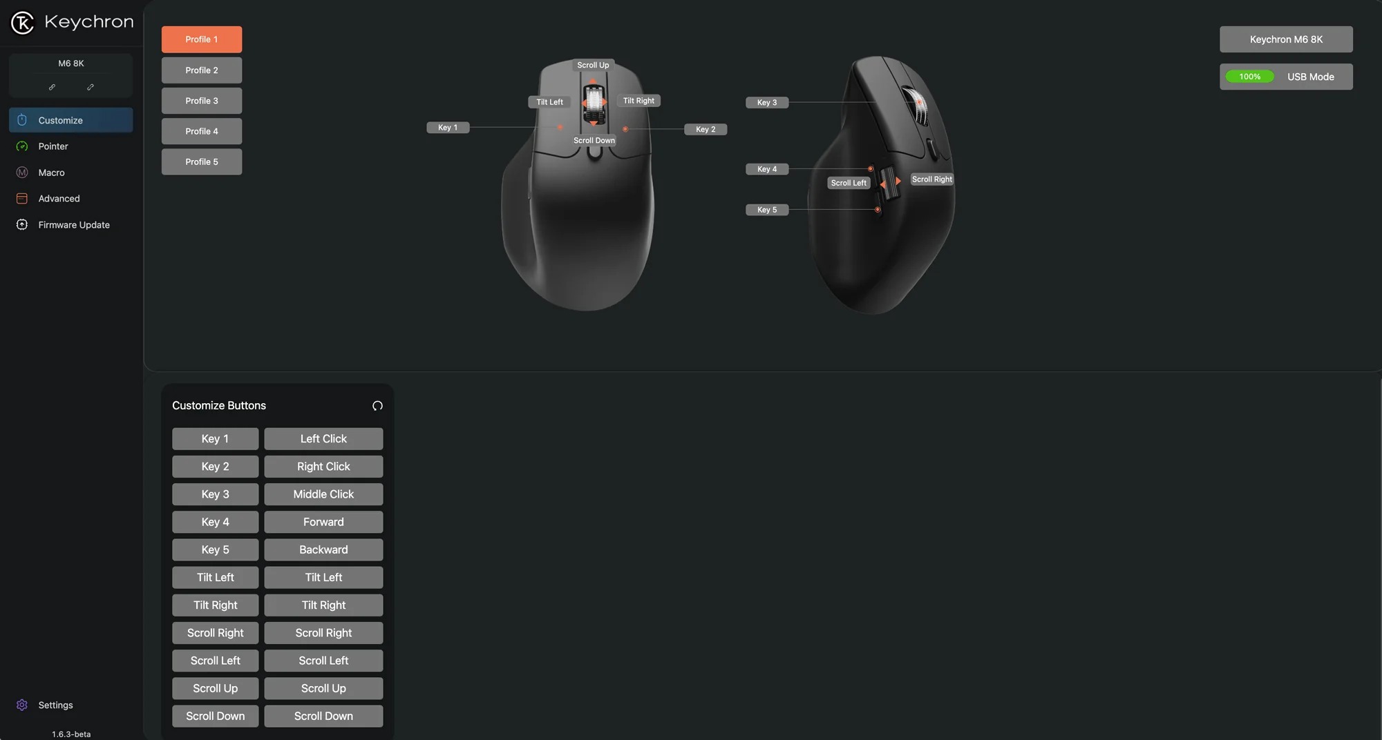 M6 có hơn 10 nút bấm có thể lập trình, bao gồm 2 nút bên cạnh và nút điều chỉnh DPI. Con lăn kép hỗ trợ chuyển đổi giữa chế độ cuộn chuẩn (notched) và cuộn vô cực (infinite scroll), lý tưởng cho cả gaming và duyệt tài liệu dài. Phần mềm Keychron Engine cho phép tùy chỉnh macro, DPI, polling rate, LOD và các thiết lập nâng cao, lưu trữ trên bộ nhớ onboard.