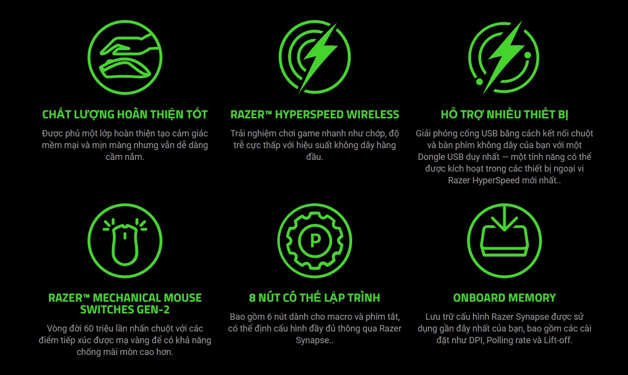 • Chuẩn kết nối: Razer HyperSpeed Wireless (2.4 GHz)