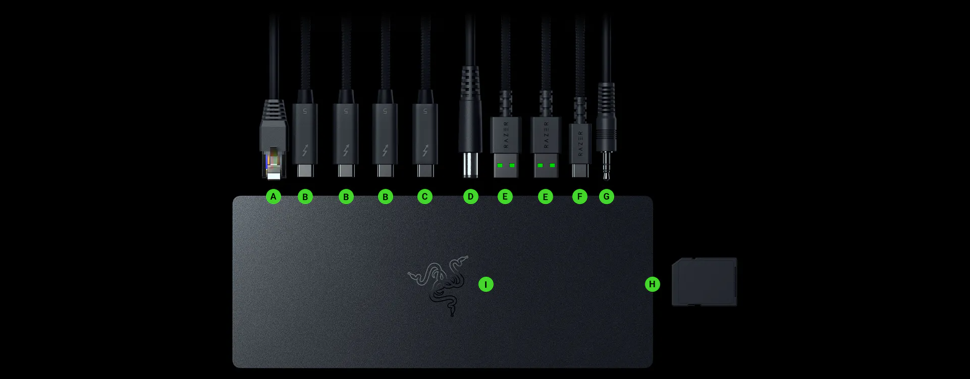 Razer Thunderbolt™ 5 Dock Chroma được trang bị 10 cổng kết nối đa dạng, bao gồm: