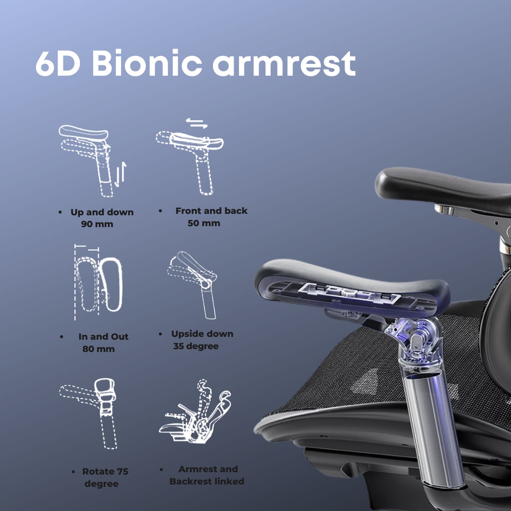Đỡ tay của ghế công thái học Sihoo A3 là đỡ tay 6D đồng bộ với ngả lưng. Phù hợp cho bất kỳ tư thế nào của người ngồi. Hiện thị trường chỉ có sihoo A3 có bệ đỡ tay 6D