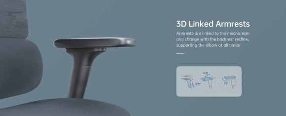 Tay vịn nghiêng đồng bộ, 5 bánh răng có thể điều chỉnh lên xuống, mặt tựa tay 3D PU, mặt tựa tay có thể đẩy tới trước/sau, trái/phải, cảm ứng tinh tế, thư giãn cánh tay.