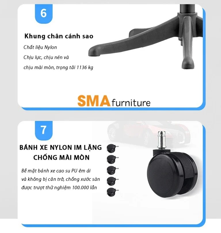 | Chân ghế | Thiết kế khung chân 5 trấu chắc chắn, chất liệu nhựa văn phòng cao cấp chịu trọng tải lên tới 200 kg |