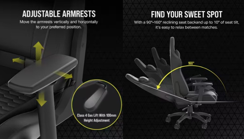 Tựa lưng điều chỉnh từ 90° đến 160°, cho phép bạn ngồi thẳng khi chơi hoặc ngả lưng thư giãn. Kết hợp với gối lưng, ghế mang lại sự hỗ trợ lý tưởng cho mọi tư thế.