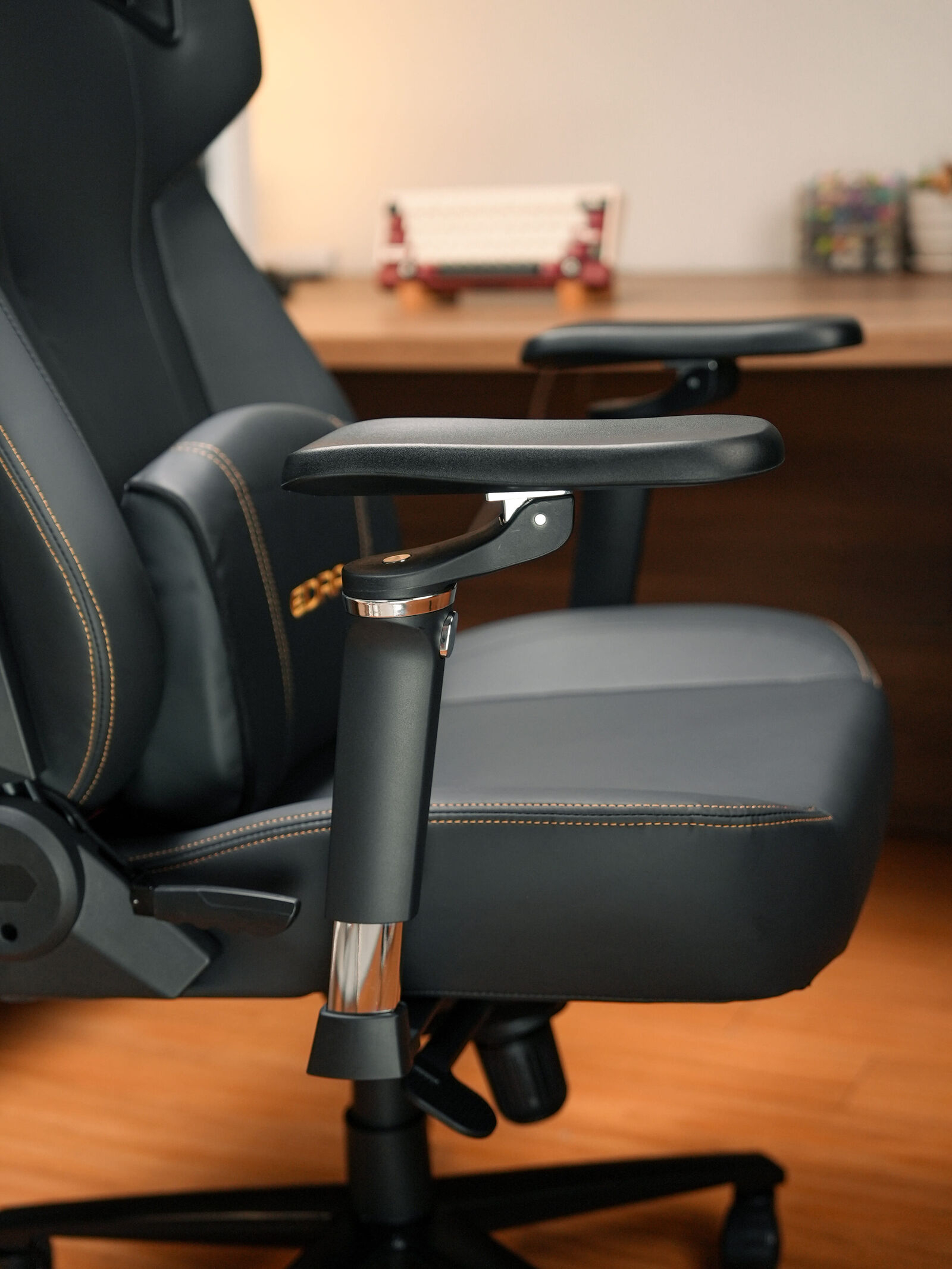 Kê tay 6D có thể điều chỉnh chiều cao, độ sâu, góc nghiêng, xoay 360 độ, bật lên/xuống và trượt trước/sau, hỗ trợ tư thế tay tự nhiên khi chơi game hoặc gõ phím. Có núm vặn điều chỉnh độ phồng của lưng ghế, giúp tùy chỉnh theo hình dáng cơ thể cá nhân.