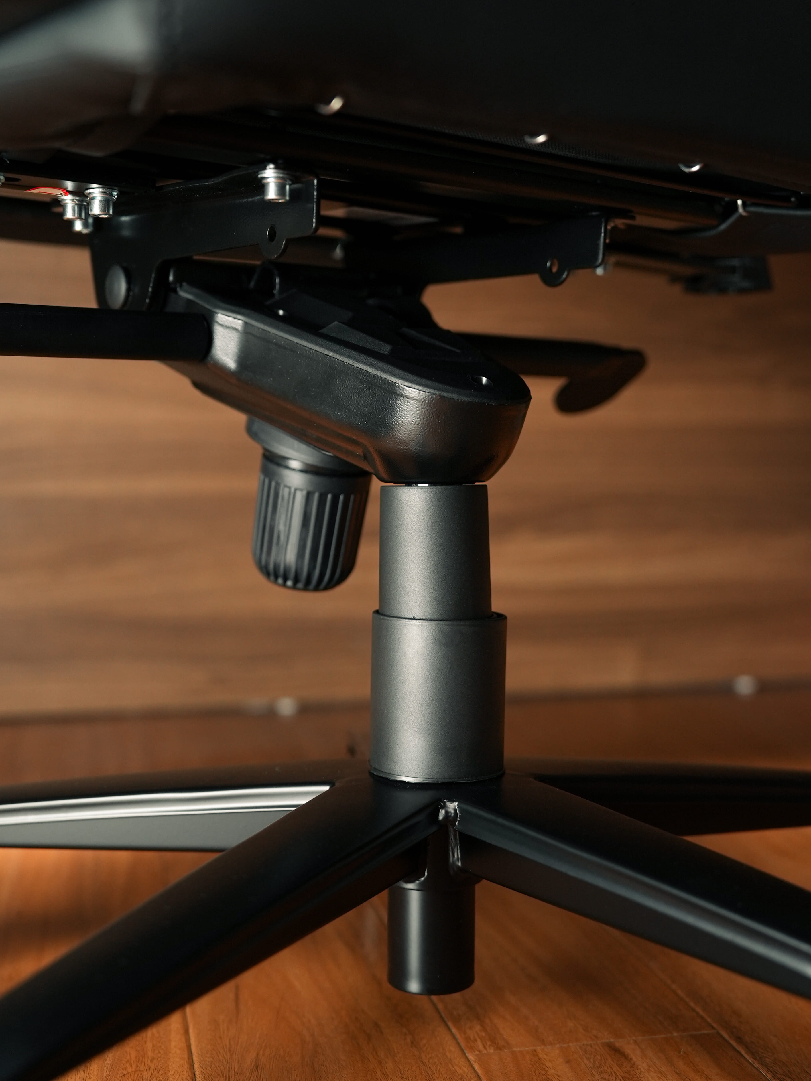 Khung chân nhôm nguyên khối, đường kính 70cm, kết hợp piston Class 4 chịu lực 150kg. Bánh xe PU cao cấp được thiết kế chống ồn, lăn êm ái trên mọi bề mặt sàn mà không gây tiếng động, đảm bảo độ bền và an toàn khi sử dụng.