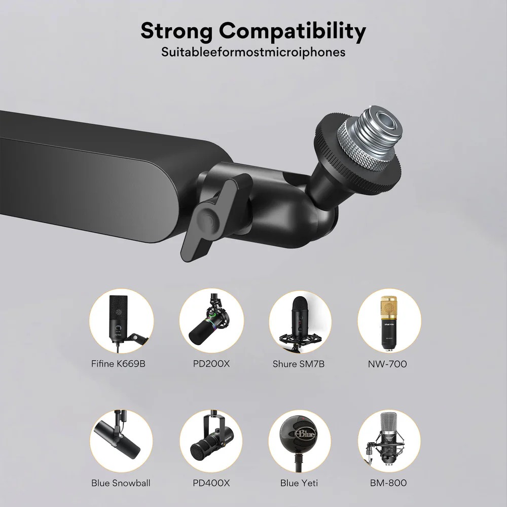 Có thể kẹp bàn hoặc khoan vít cố định, đi kèm vít và phụ kiện đầy đủ. Adapter 3/8" to 5/8" chuẩn, tương thích hầu hết mic thu âm như Maono PM500, PD200X, Fifine, Rode, Shure...