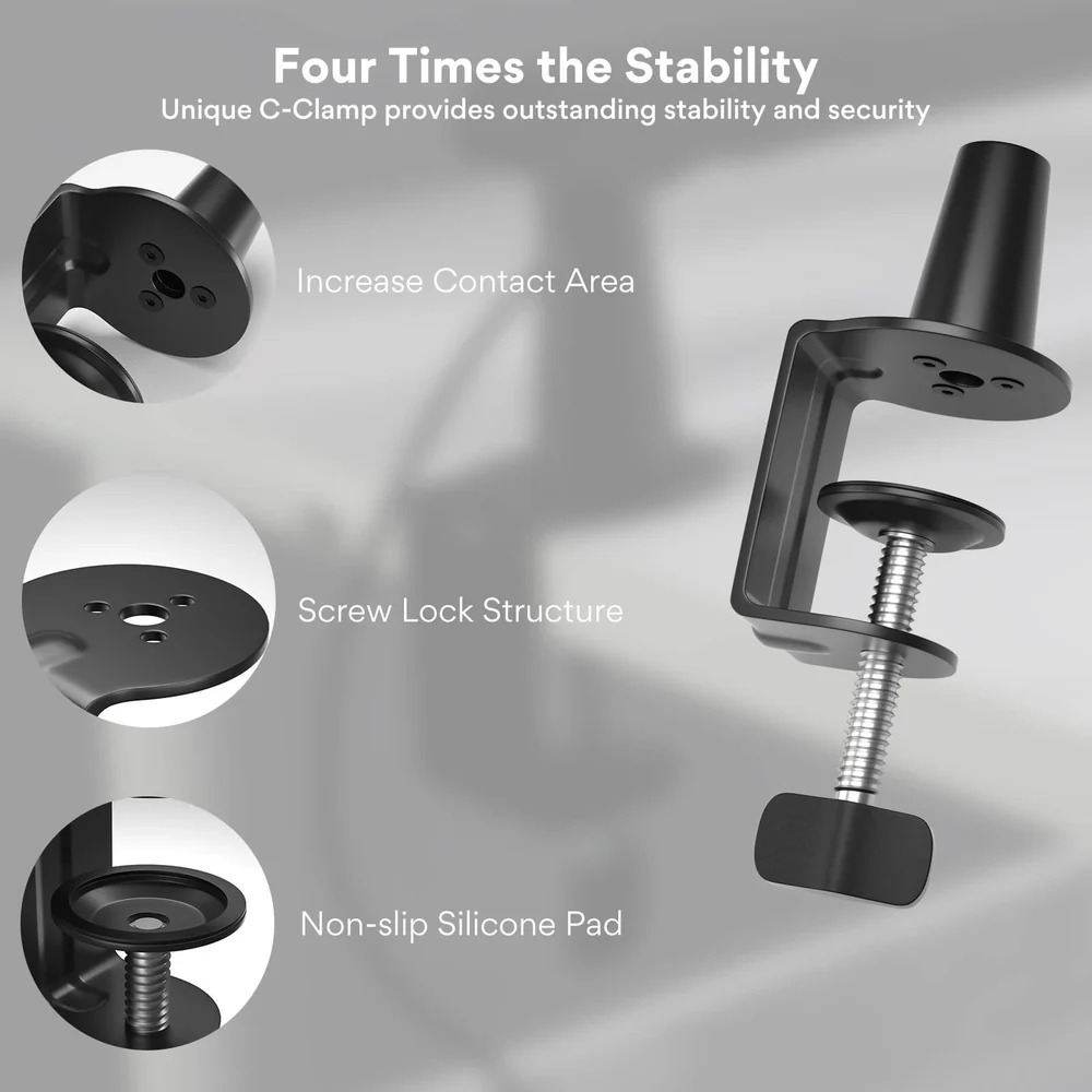 Tích hợp rãnh quản lý cáp ẩn bên trong arm, giữ dây mic gọn gàng, không rối. Kẹp bàn chắc chắn (dày bàn 10-60mm), feet chống trượt, mang lại sự ổn định cao khi sử dụng lâu dài.