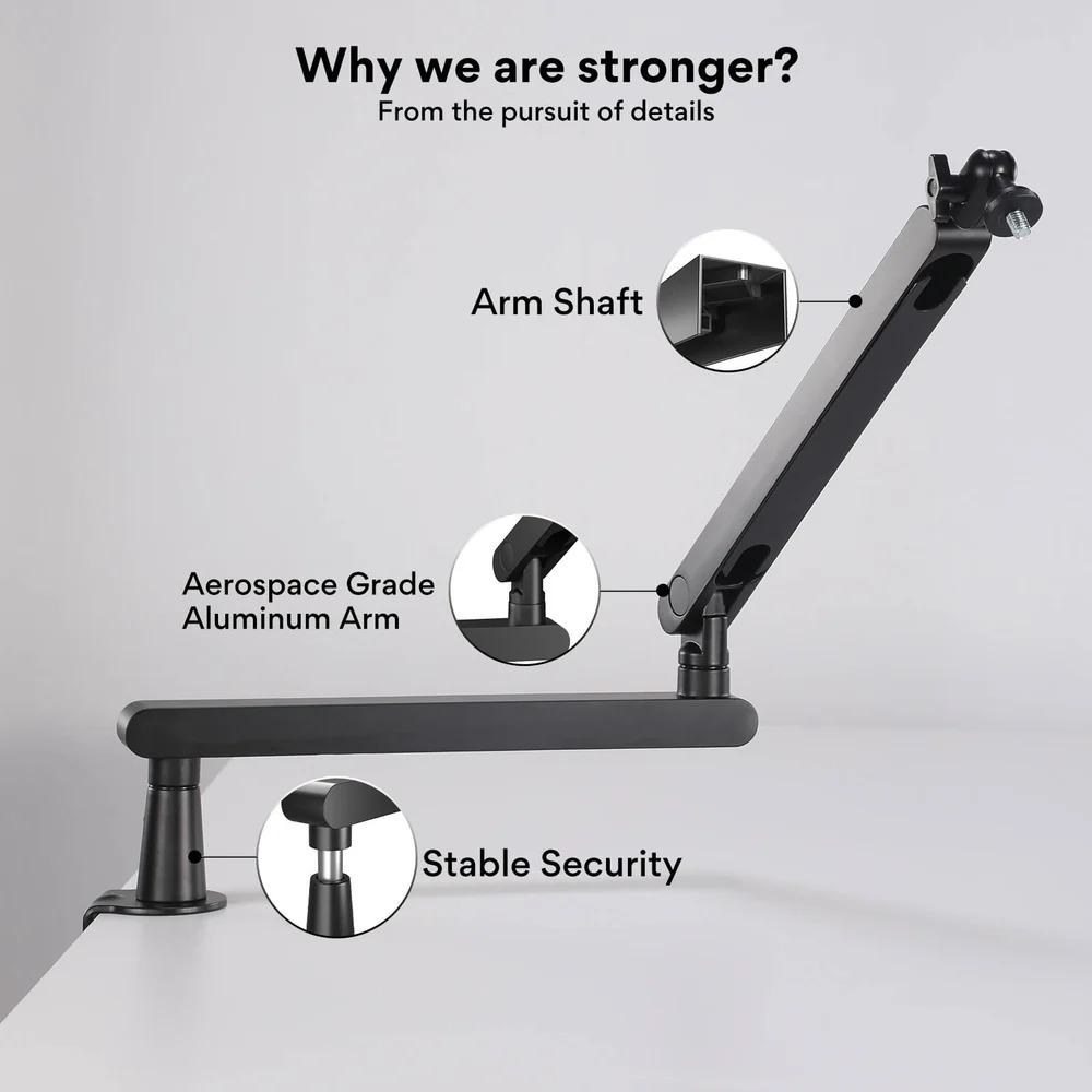 Lò xo khí nén ẩn bên trong, giảm tiếng ồn khi điều chỉnh, chịu lực tốt mà không xệ. Phù hợp cho setup chuyên nghiệp, giảm rung và giữ mic ổn định trong các buổi stream dài.