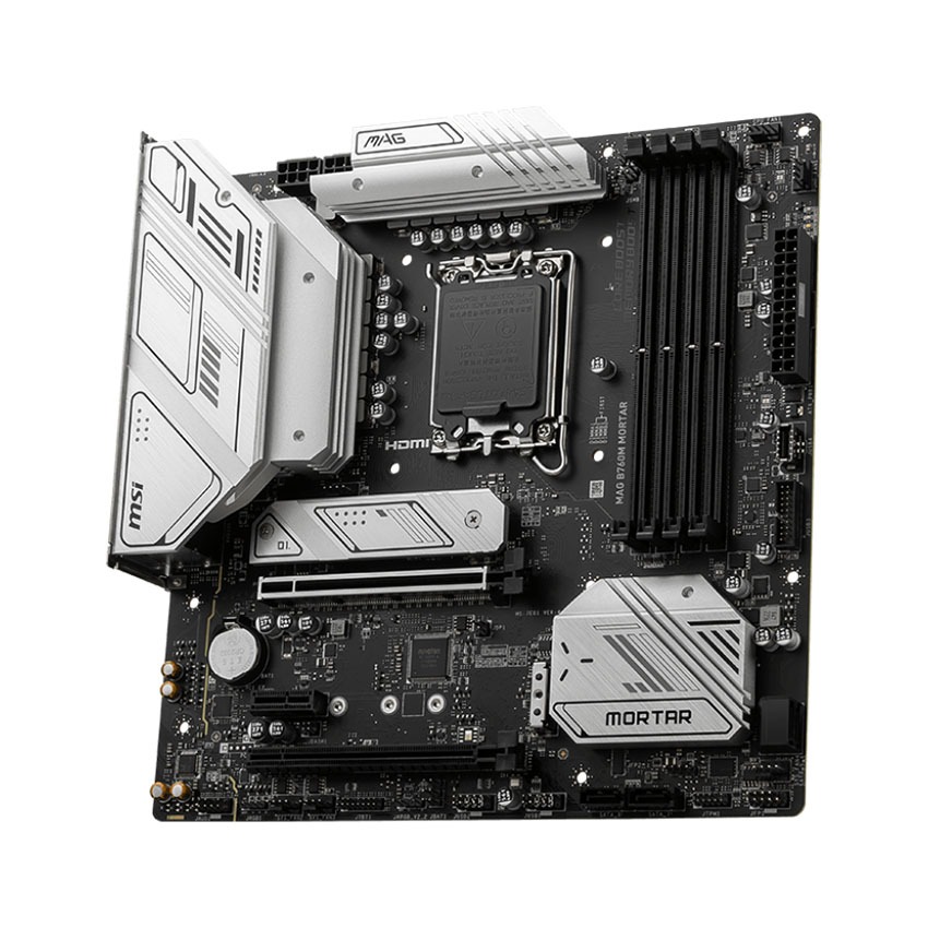 Mainboard MSI MAG B760M MORTAR Series sở hữu thiết kế mạnh mẽ nam tính, khoác lên mình vỏ kim loại sáng màu hòa mình cùng những chiếc case trắng muốt- đây chính là chiếc mainboard game thủ nào cũng muốn sở hữu.