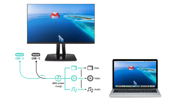 Các cổng USB-C, HDMI và DisplayPort cung cấp kết nối đa năng với laptop, PC, Mac và các thiết bị khác. USB-C hỗ trợ truyền dữ liệu, video và sạc 60W qua một dây cáp duy nhất, giúp bàn làm việc gọn gàng.