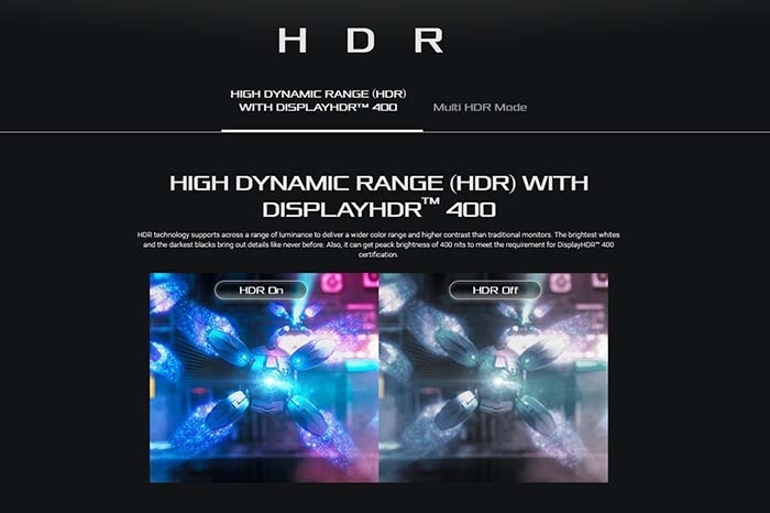 Công nghệ HDR hỗ trợ nhiều phạm vi độ sáng để mang lại dải màu rộng hơn và độ tương phản cao hơn so với màn hình truyền thống. Với màu trắng sáng nhất và màu đen tối nhất, màn hình này sẽ đem đến những hình ảnh sắc nét chưa từng thấy. Ngoài ra, độ sáng của màn hình này còn có thể tăng lên mức cao nhất là 400 nit để đáp ứng yêu cầu chứng nhận DisplayHDR™ 400.