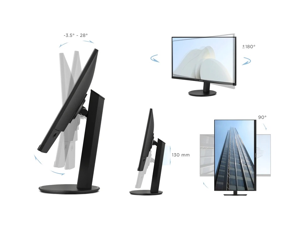 Công nghệ Eye Care với Flicker-Free chống nhấp nháy và Blue Light Filter giảm ánh sáng xanh, giúp giảm mỏi mắt khi sử dụng lâu. Thiết kế viền mỏng 3 cạnh, chân đế điều chỉnh chiều cao 130mm, xoay -30° đến 30°, nghiêng -5° đến 20°, hỗ trợ VESA 100x100mm cho lắp giá treo.