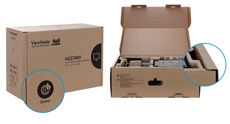 VG2740V được vận chuyển trong bao bì bằng giấy dễ dàng tái chế. Thêm vào đó nó được khoét lỗ cầm tay và in màu đơn sắc để tránh sử dụng nguyên liệu nhựa.