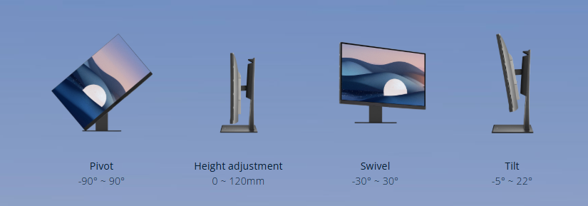 Thiết kế công thái học với chân đế xoay, nghiêng, nâng hạ và xoay dọc giúp điều chỉnh tư thế linh hoạt, bảo vệ sức khỏe người dùng khi làm việc trong thời gian dài. Các chế độ hiển thị như CAD/CAM, Clarity Boost, Gaming Mode giúp tối ưu hóa trải nghiệm theo từng mục đích sử dụng.