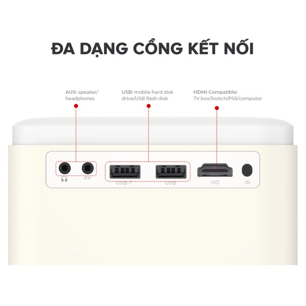 Đi kèm remote, cáp HDMI, giá đỡ, hướng dẫn sử dụng. Trọng lượng nhẹ khoảng 2.5kg, dễ di chuyển, lắp đặt nhanh chóng cho mọi không gian.