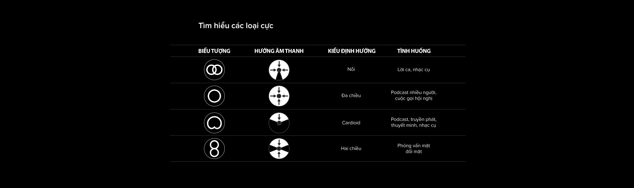 Chọn giữa bốn dạng định hướng (lập thể, đa chiều, cardioid, hai chiều) để tối ưu hóa cấu hình phát thanh của bạn và luôn giữ được sự tập trung vào những âm thanh mà bạn muốn nghe.