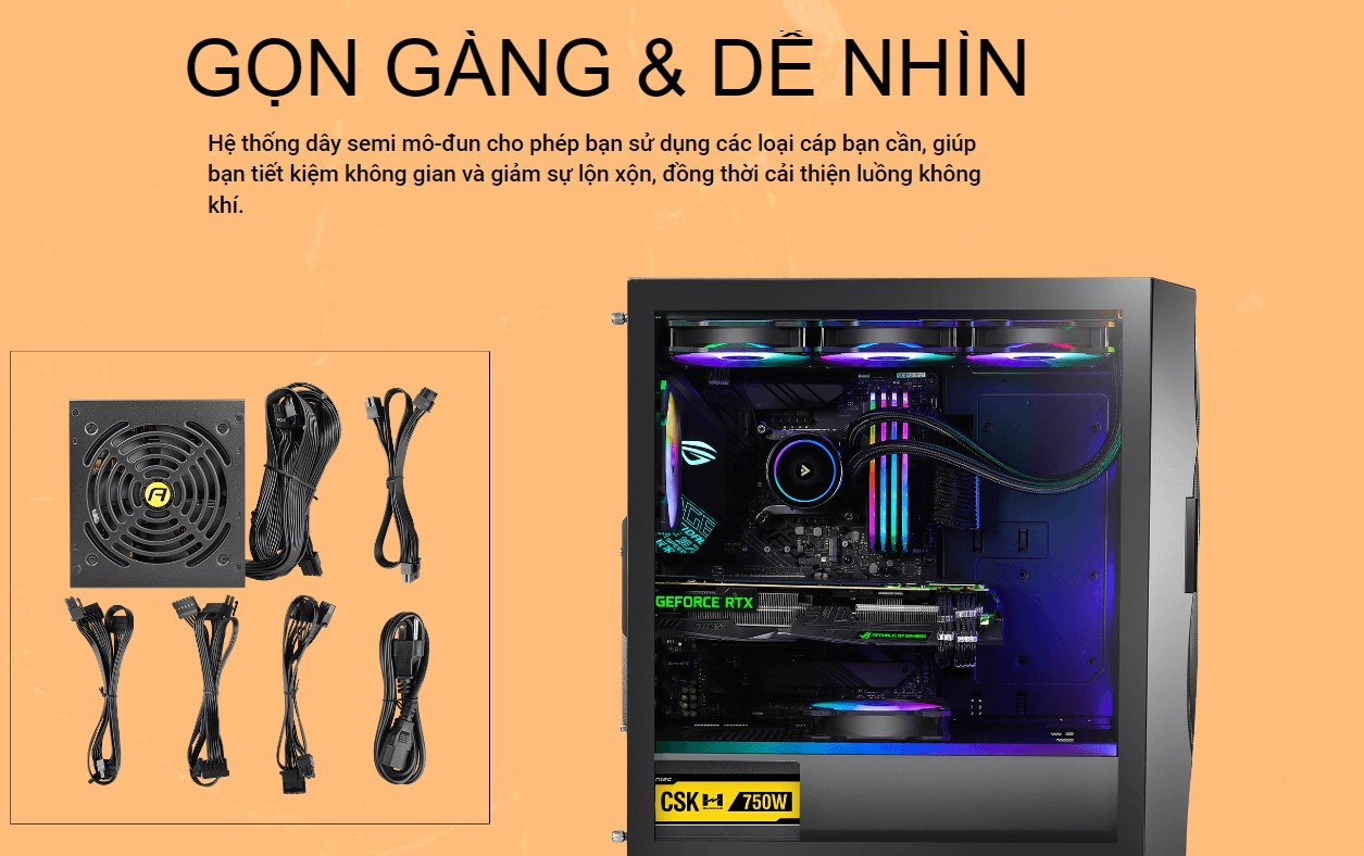 Hệ thống dây semi mô-đun cho phép bạn sử dụng các loại cáp bạn cần, giúp bạn tiết kiệm không gian và giảm sự lộn xộn, đồng thời cải thiện luồng không khí.