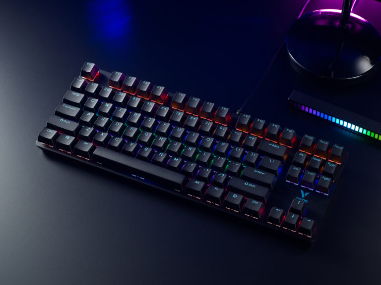 V500Pro-87 dùng switch Rapoo: Blue (tactile, clicky, 50g, 4.0mm), Brown (tactile nhẹ, 45g, 4.0mm), Red (linear, 45g, 3.6mm), độ bền 60 triệu lần nhấn. Blue phù hợp gõ văn bản, Brown cân bằng gõ/game, Red lý tưởng cho gaming (FPS như Valorant). N-key rollover (dây) và 6-key rollover (không dây) đảm bảo không xung đột phím, hỗ trợ lệnh phức tạp. Keycap PBT double-shot dày 1.5mm, chống mài mòn, nhưng không hotswap, hạn chế tùy chỉnh switch. Switch Rapoo gõ mượt, nhưng Blue hơi ồn (văn phòng), Red nhẹ với người thích lực nhấn mạnh, và không có foam tiêu âm, gây vang nhẹ.