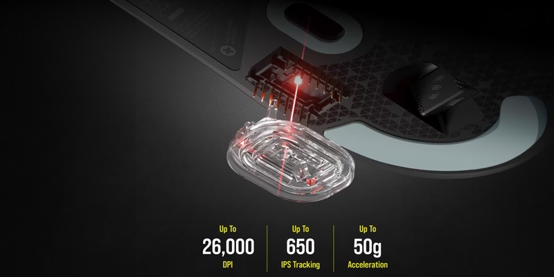 | Cảm biến | Corsair Marksman (PixArt PAW3393) |