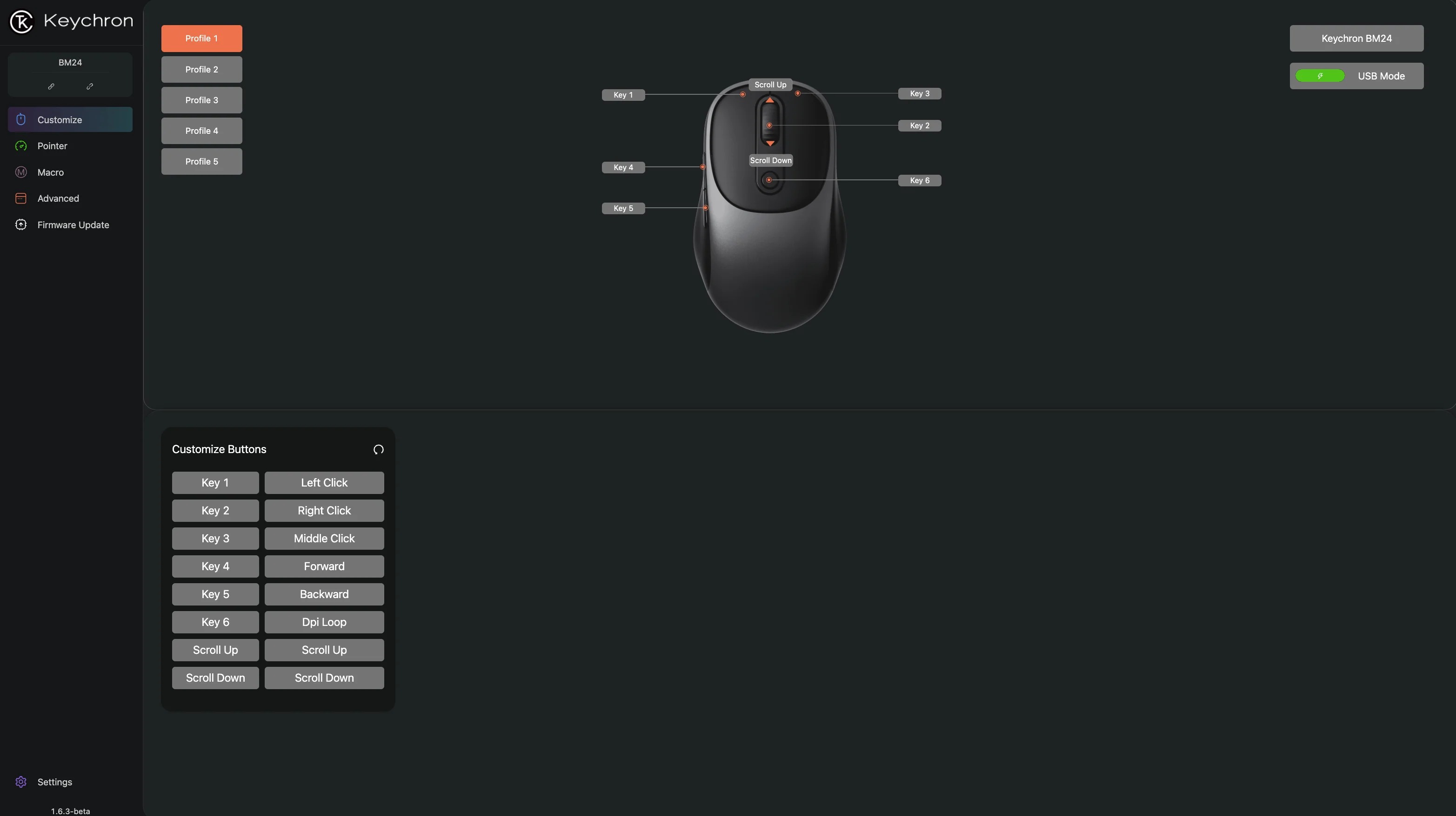 6 nút bấm với switch Omron độ bền 60 triệu lần click, phản hồi nhanh và xúc giác rõ ràng. Hỗ trợ phần mềm Keychron cho tùy chỉnh DPI, macro, và profile onboard lưu trữ 5 cấu hình. Nút bên hông có thể lập trình cho hành động tùy chỉnh trong game.