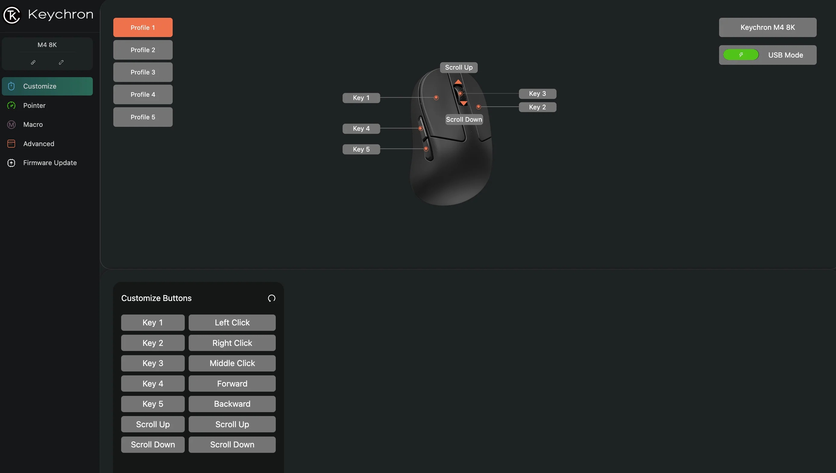 M4 có 6 nút bấm với switch Huano 80M, độ bền lên đến 80 triệu lần click, mang lại cảm giác click rõ ràng và nhanh nhạy. Nút DPI và polling rate tích hợp bên ngoài cho phép điều chỉnh mà không cần phần mềm. Phần mềm Keychron Engine hỗ trợ lập trình macro, LOD, polling rate và lưu trữ profile onboard.