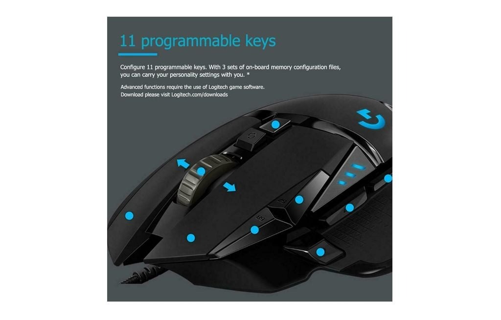 G502 HERO có 11 nút lập trình, bao gồm trái/phải, bánh xe (L/R tilt), nút DPI up/down, nút sniper (DPI shift), và 3 nút bên (G7/G8/G9). Tất cả đều có thể gán macro, phím tắt, hoặc lệnh qua Logitech G HUB, hỗ trợ profile riêng cho từng game. Nút chính sử dụng công tắc Omron bền 20 triệu lần nhấn, với hệ thống căng lò xo kim loại cho cảm giác click rõ ràng. Bánh xe cuộn kim loại hỗ trợ chế độ hyper-fast (cuộn tự do) và ratcheted (cuộn có khía), cùng L/R tilt cho cuộn ngang, rất hữu ích cho cả gaming và văn phòng. Tuy nhiên, nút G7/G8 dễ bấm nhầm với tay lớn, và nút sniper có thể khó tiếp cận với một số người.