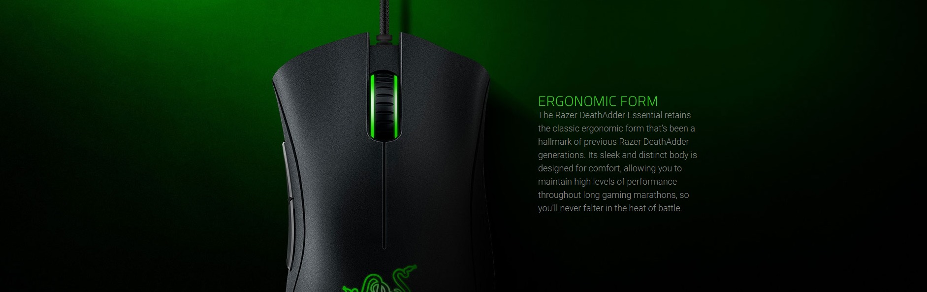Chuột gaming DeathAdder Essential được Razer thiết kế với kiểu dáng công thái học (Ergonomic) cổ điển. Thiết kế đẹp mắt và khác biệt ở các dòng chuột gaming khác tạo ra sự thoải mái, cho phép người chơi duy trì mức hiệu suất cao trong suốt thời gian chơi game dài, vì vậy bạn sẽ không bao giờ bị ngập ngừng trong các trận chiến nóng bỏng.