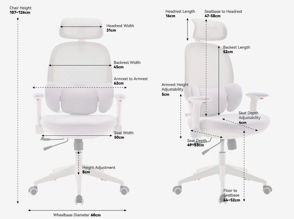Tựa đầu điều chỉnh chiều cao và góc nghiêng, hỗ trợ cổ và vai. Thắt lưng Simplefit điều chỉnh vô cực, ôm sát lưng người dùng, giúp duy trì tư thế chuẩn.