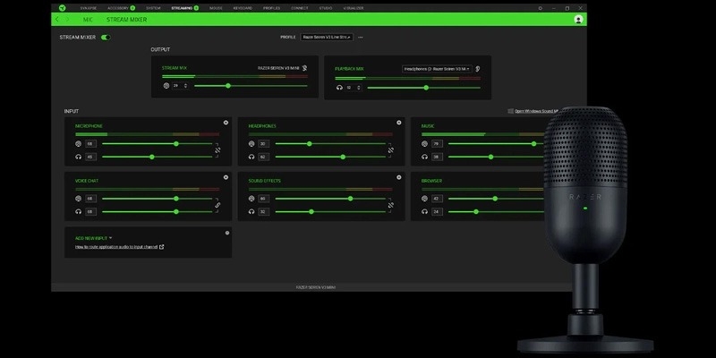 - Razer Seiren V3 Mini tương thích với phần mềm Razer Synapse. Với Synapse, bạn có thể tùy chỉnh cài đặt âm thanh nâng cao như: Mức tăng âm lượng, mức độ lọc tiếng ồn, cân bằng âm thanh, âm thanh micrô