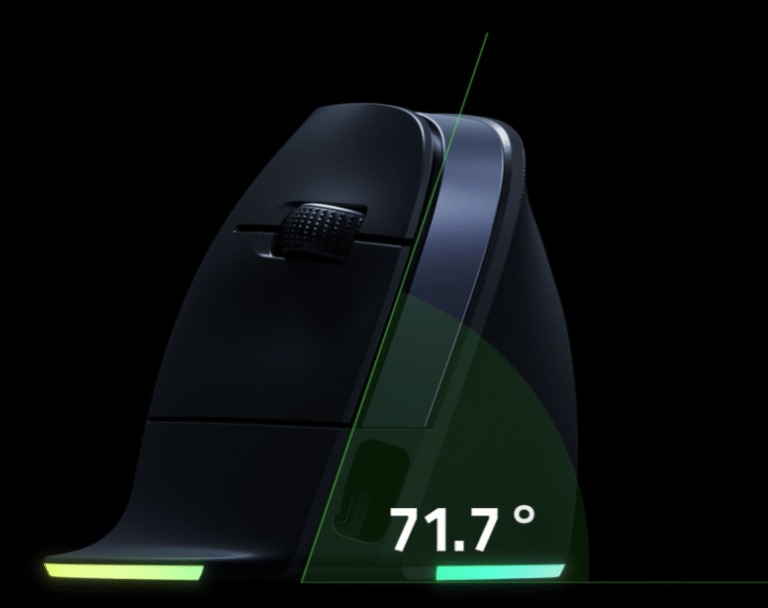 Với góc nghiêng 71,7 độ, Razer Pro Click V2 Vertical cho cảm giác cầm giống như bắt tay – tư thế tự nhiên giúp hạn chế áp lực lên cổ tay và cánh tay. Phần đế chuột mở rộng nâng nhẹ cổ tay lên, trong khi khoét ngón tay cái sâu tạo điểm tựa chắc chắn và thoải mái.