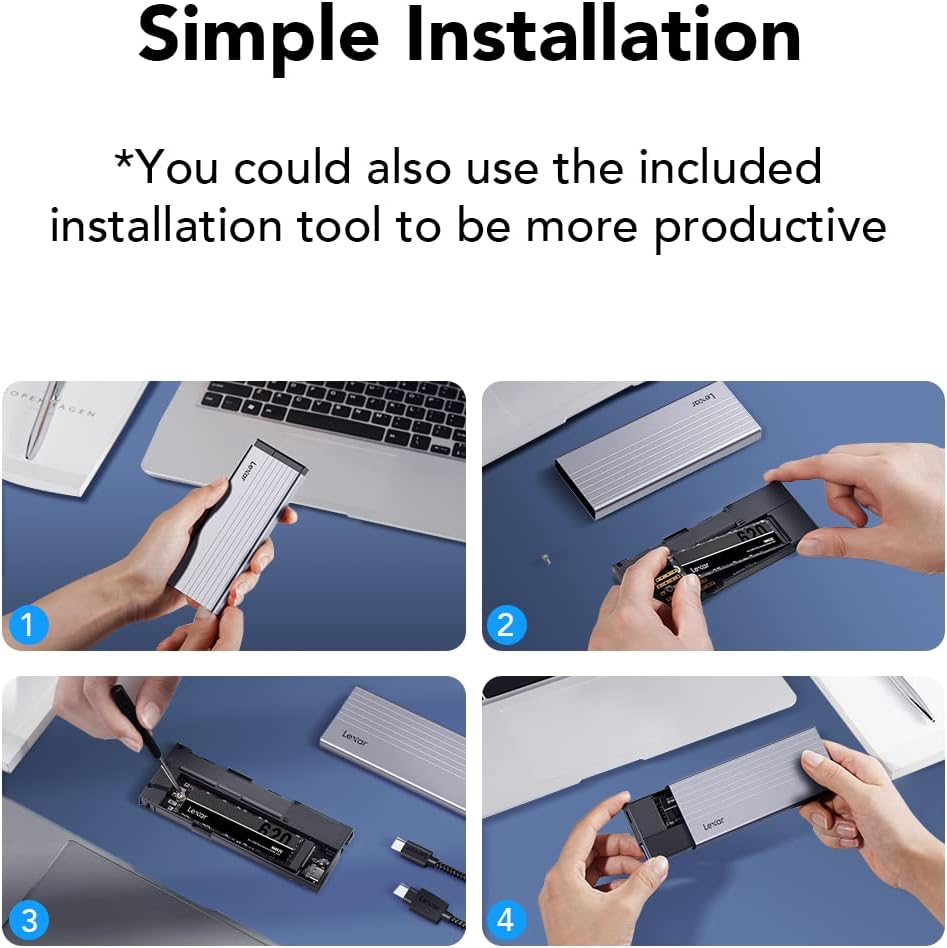 Lexar E10 hỗ trợ nhiều kích thước ổ M.2 NVMe thông dụng như 2230, 2242, 2260 và 2280, giúp người dùng linh hoạt trong việc lựa chọn và nâng cấp bộ nhớ. Cơ chế lắp đặt không cần công cụ giúp việc tháo lắp trở nên đơn giản, tiết kiệm thời gian và thuận tiện khi sử dụng.