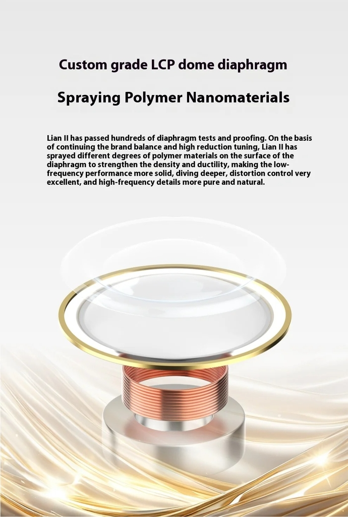 Màng loa LCP "Ball Top" 10mm: Feaulle Lian 2 sử dụng củ loa dynamic 10mm với màng loa Liquid Crystal Polymer (LCP) được tùy chỉnh đặc biệt, mang lại độ cứng vượt trội và tốc độ phản hồi nhanh. Độ méo tiếng cực thấp (THD ≤ 0.2%) đảm bảo âm thanh chi tiết, sống động.